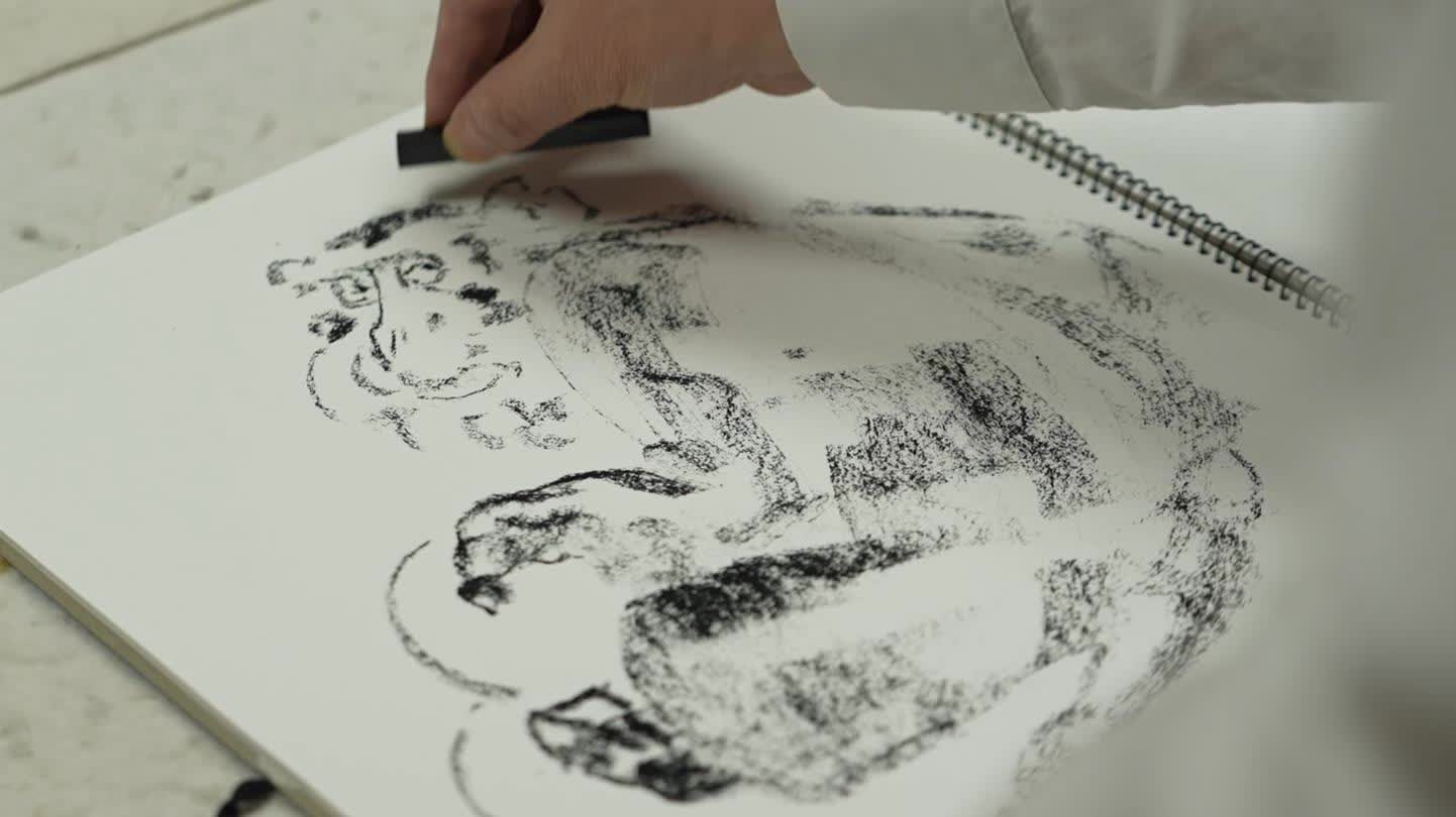 李燕:我叫「毛毛畫法」,是我自己創造的一種技巧,不是毛筆畫的。但這個不適合用在教學,他如果掌握不了解剖結構,用了這個之後的毛有時候戧着茬長的,解決什麼問題,所有畫毛都是朝着兩方面長的,很難畫往前對着你的毛,可是很多人畫毛,有的像水洗了貼在上面,可是蓬鬆的毛,小老虎、大老虎它皮和毛露結構露得多,小老虎毛茸茸的,好玩兒就好玩兒在這,猴子也是這樣,不止一種小動物都是毛茸茸的。