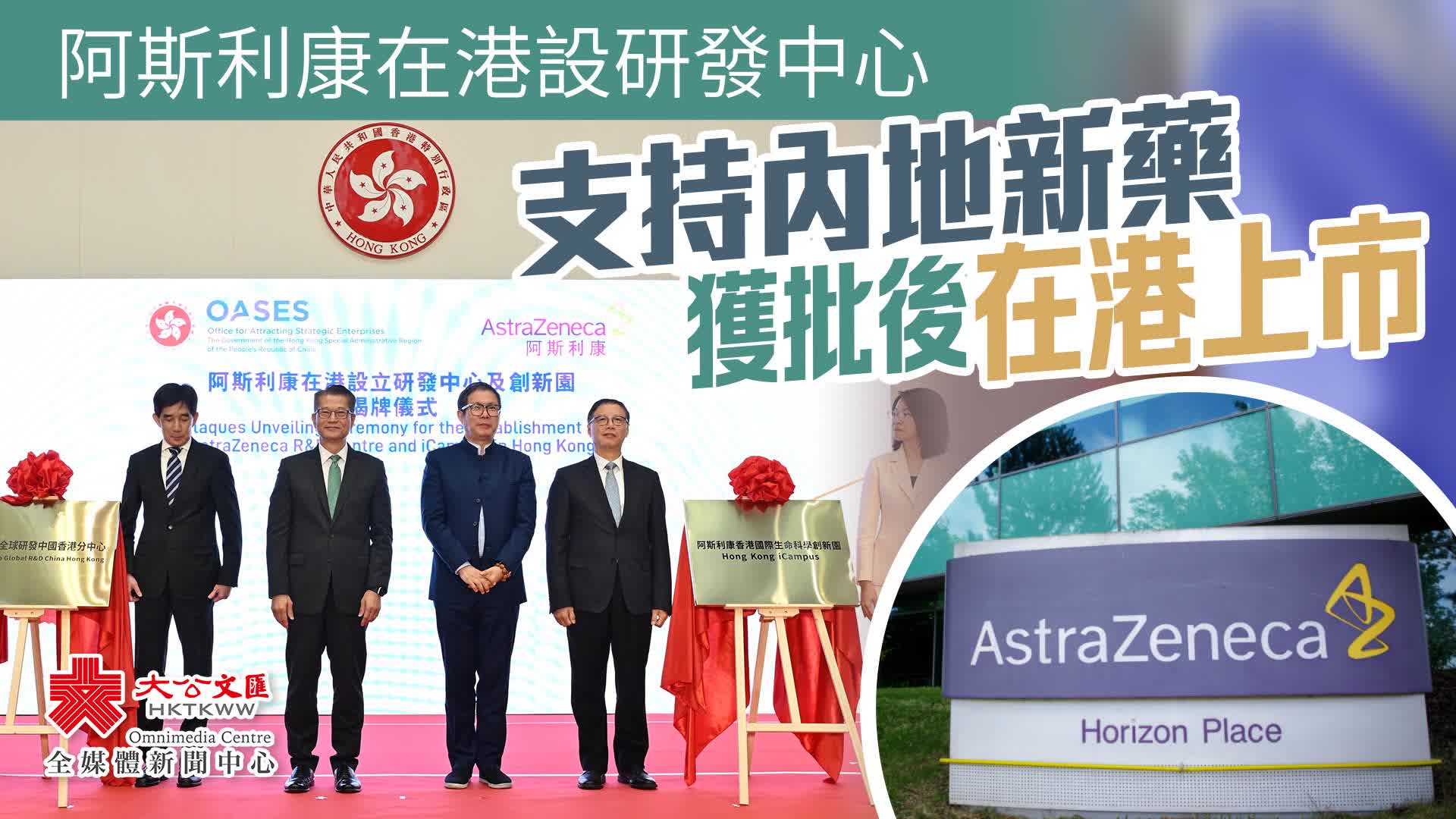 財政司司長陳茂波則指,對於阿斯利康來港設立研發中心,感到非常鼓舞,將會是香港首個有全球前十大藥企設立的研發中心。該中心將會專注細胞治療、基因治療等重點領域的藥物研發。