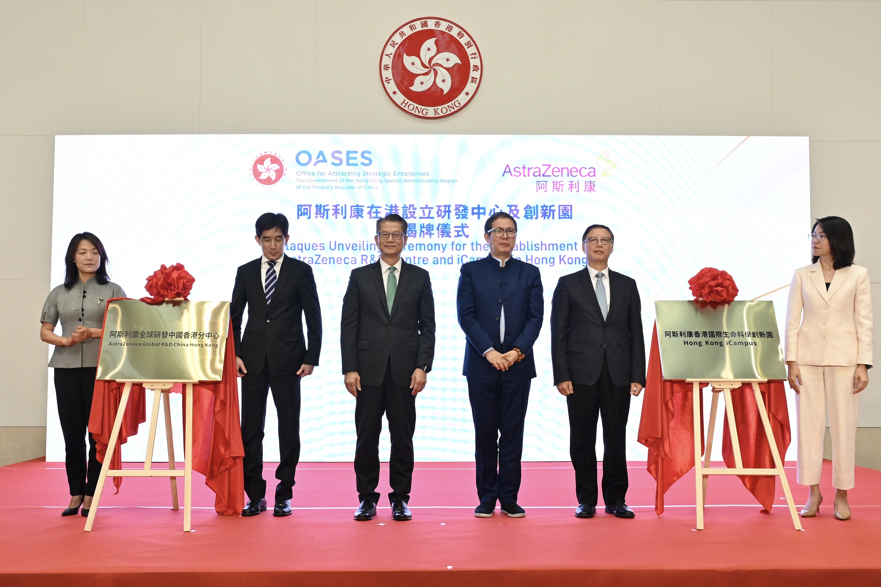 經過一年來與特區政府商討,英國生物製藥企業阿斯利康決定來港設立研發中心及創新園。今日舉行的揭牌儀式,由財政司司長陳茂波、引進重點企業辦公室主任容偉雄、阿斯利康全球執行副總裁王磊等主持。