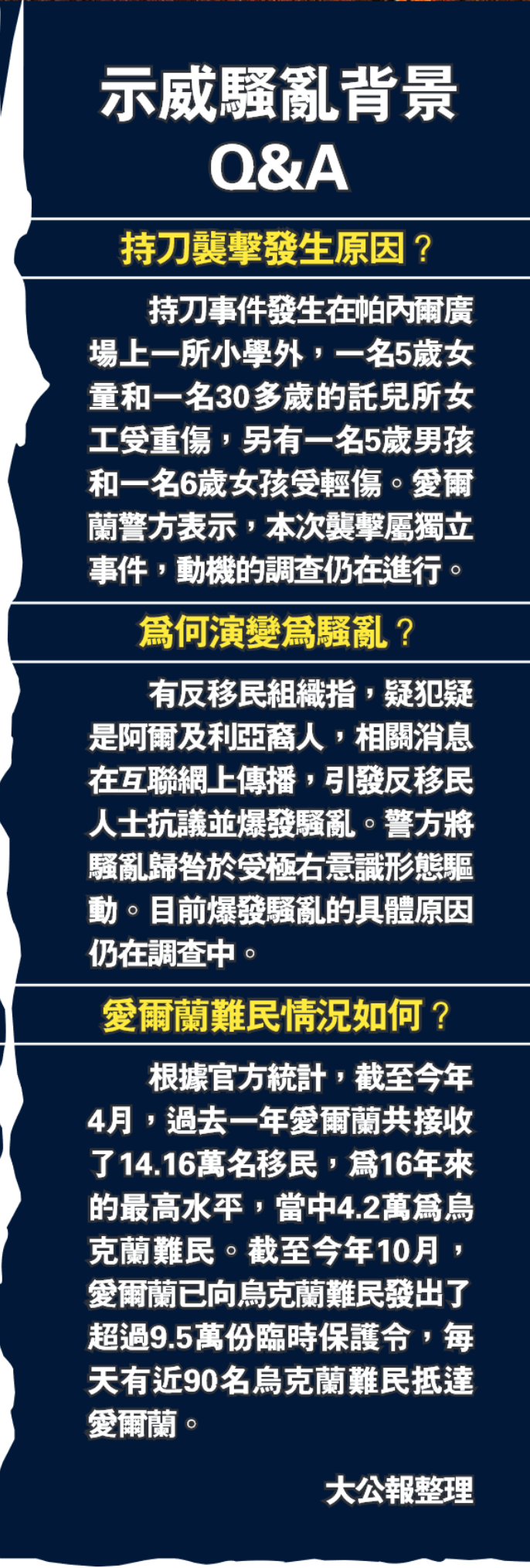 大公報綜合路透社、BBC、《愛爾蘭時報》報道,當地時間23日,愛爾蘭首都都柏林市中心發生持刀襲擊事件,造成5人受傷,其中3人是兒童。由於社交媒體上有人散播疑犯為外籍人士的謠言,引發都柏林反移民示威,隨後又演變為嚴重騷亂。分析指出,隨着歐洲國家內部因難民等問題撕裂加劇,發生極端事件的風險大幅增加。