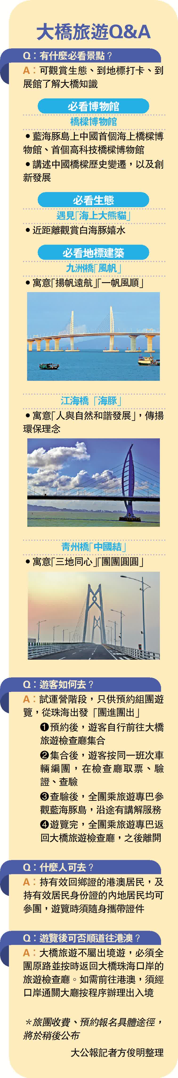 「我十分期待,特別想去『藍海豚島』,又多了一個打卡好地方!」港青曉冬興奮地說,之前搭大橋穿梭巴士從香港到珠海時,已希望將來可專門遊覽大橋和人工島。他計劃約女友來一場浪漫大橋遊,「除了領略『超級工程』的風采外,好想見到中華白海豚」。