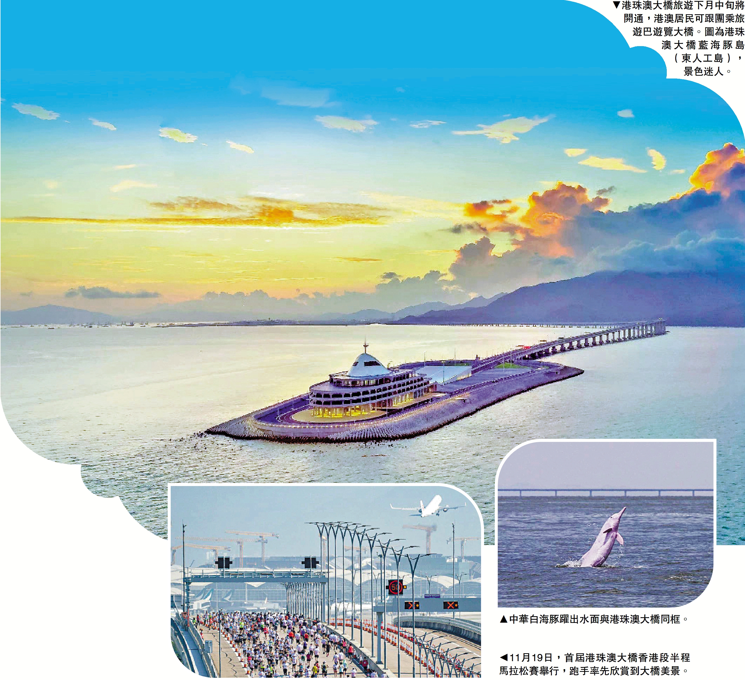 (大公報記者 方俊明 珠海報道)本月19日,八千名半馬跑手走上港珠澳大橋,飽覽大橋獨特美景,這種快樂你很快也可享受!昨日(24日),珠海市宣布下月中旬將開通港珠澳大橋旅遊,港澳和內地居民皆可「預約組團」,經大橋珠海公路口岸出發,「團進團出」乘旅遊巴遊覽大橋,登陸美麗的藍海豚島(東人工島),到地標打卡,運氣好的話還可一睹中華白海豚風采,全程歷時約140分鐘。
