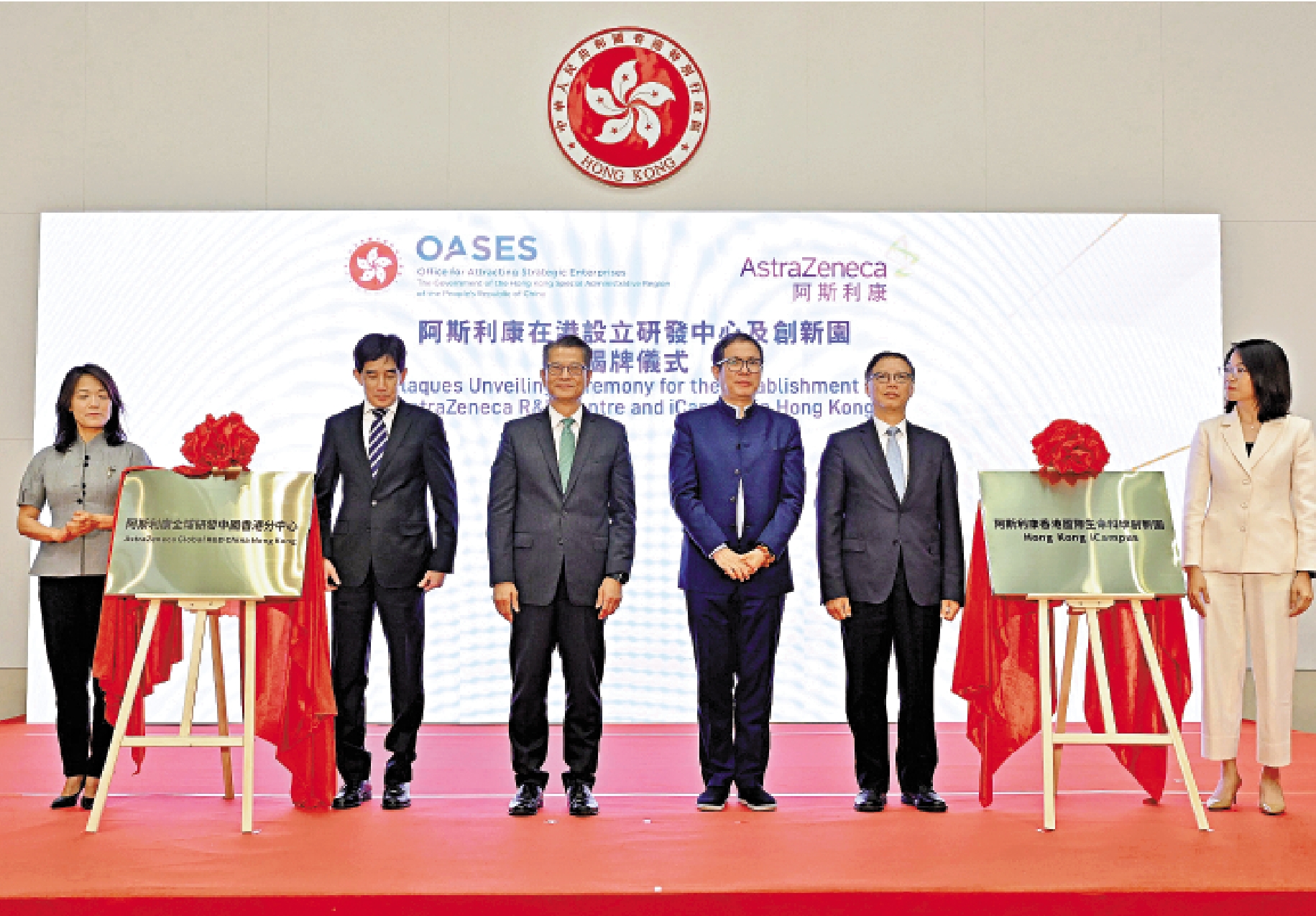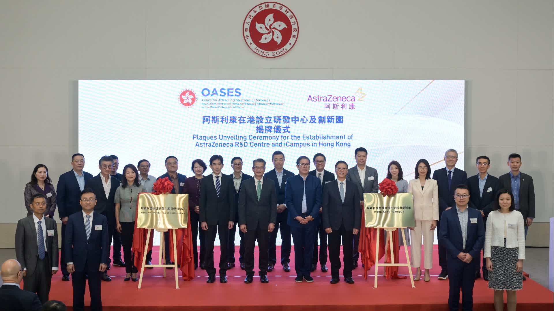 (大公報記者 李清、秦英偉)香港特區政府「搶企業」措施成效益彰。英國生物製藥企業阿斯利康在香港設立研發中心及香港國際生命科學創新園(Hong Kong iCampus),揭牌儀式昨日在政府總部舉行,由財政司司長陳茂波、引進重點企業辦公室主任容偉雄、阿斯利康全球執行副總裁王磊等主持並致辭。
