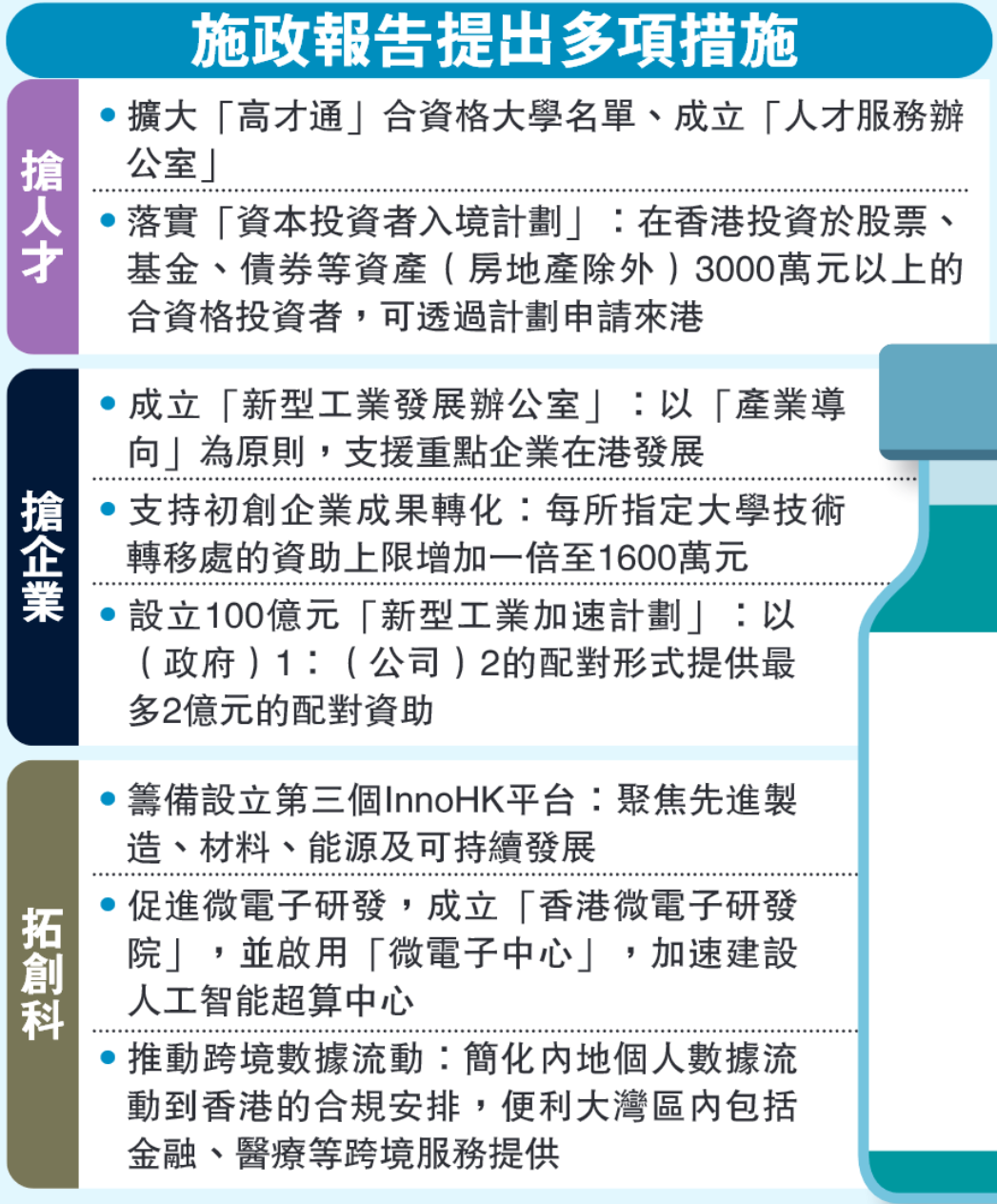 「招商引才專組」已於政府駐內地辦事處及駐外經貿辦事處成立,各專組將主動接觸目標企業和人才,並提供度身訂造方案。專組亦會聯繫世界百強大學,推廣各項計劃。他們亦會加強聯繫在內地和海外留學或工作的港人,鼓勵他們回港發展。
