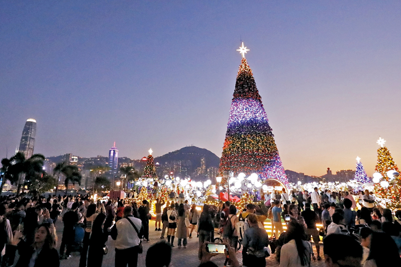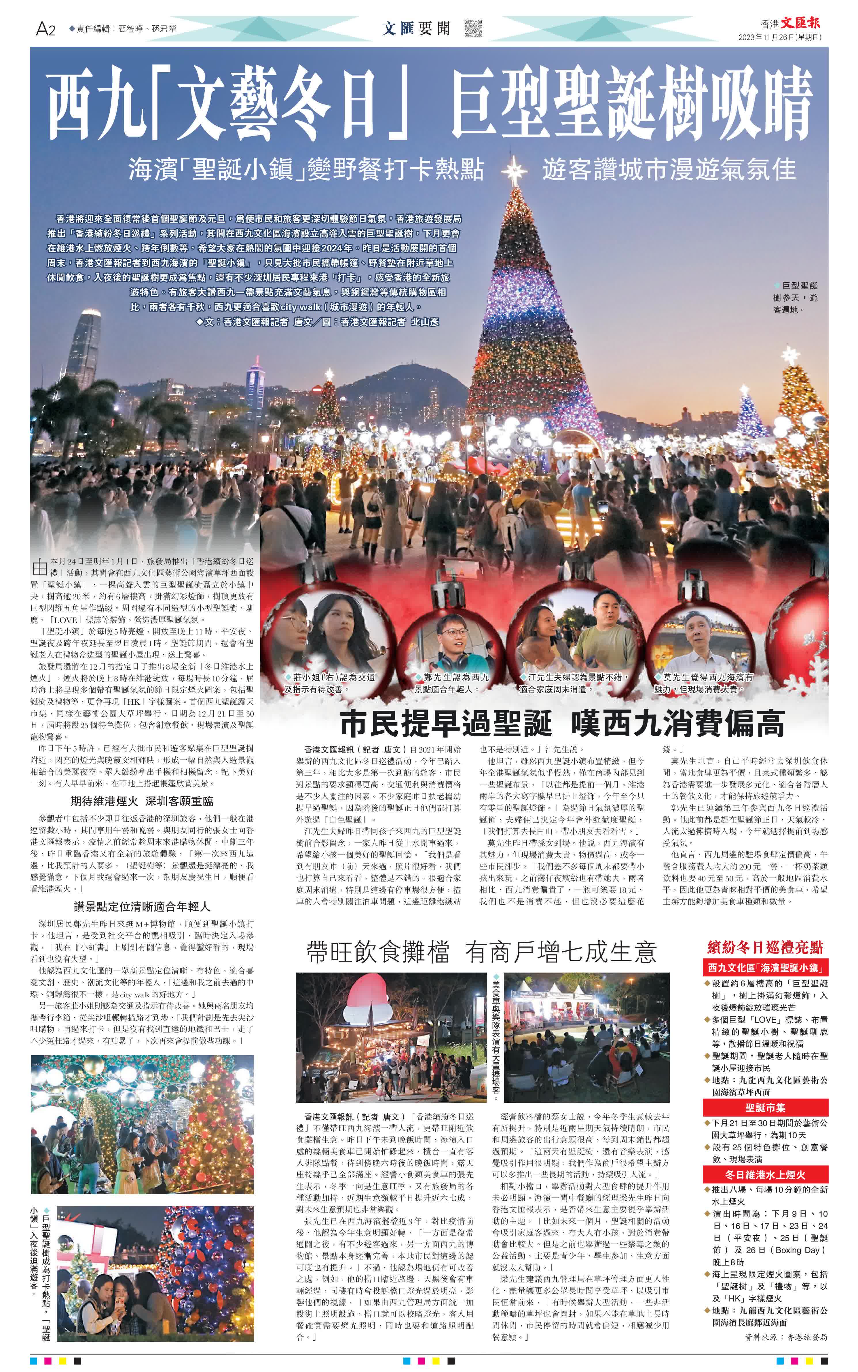 (香港文匯報記者 唐文)香港將迎來全面復常後首個聖誕節及元旦,為使市民和旅客更深切體驗節日氣氛,香港旅遊發展局推出「香港繽紛冬日巡禮」系列活動,其間在西九文化區海濱設立高聳入雲的巨型聖誕樹,下月更會在維港水上燃放煙火、跨年倒數等,希望大家在熱鬧的氛圍中迎接2024年。昨日是活動展開的首個周末,香港文匯報記者到西九海濱的「聖誕小鎮」,只見大批市民攜帶帳篷、野餐墊在附近草地上休閒飲食,入夜後的聖誕樹更成為焦點,還有不少深圳居民專程來港「打卡」,感受香港的全新旅遊特色。有旅客大讚西九一帶景點充滿文藝氣息,與銅鑼灣等傳統購物區相比,兩者各有千秋,西九更適合喜歡city walk(城市漫遊)的年輕人。