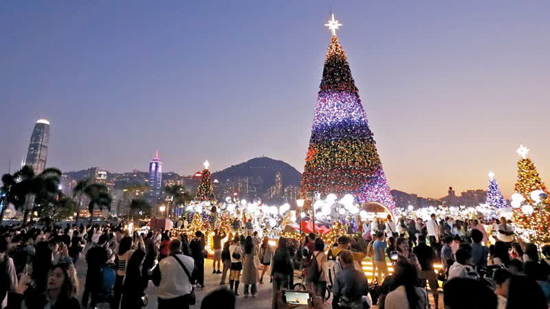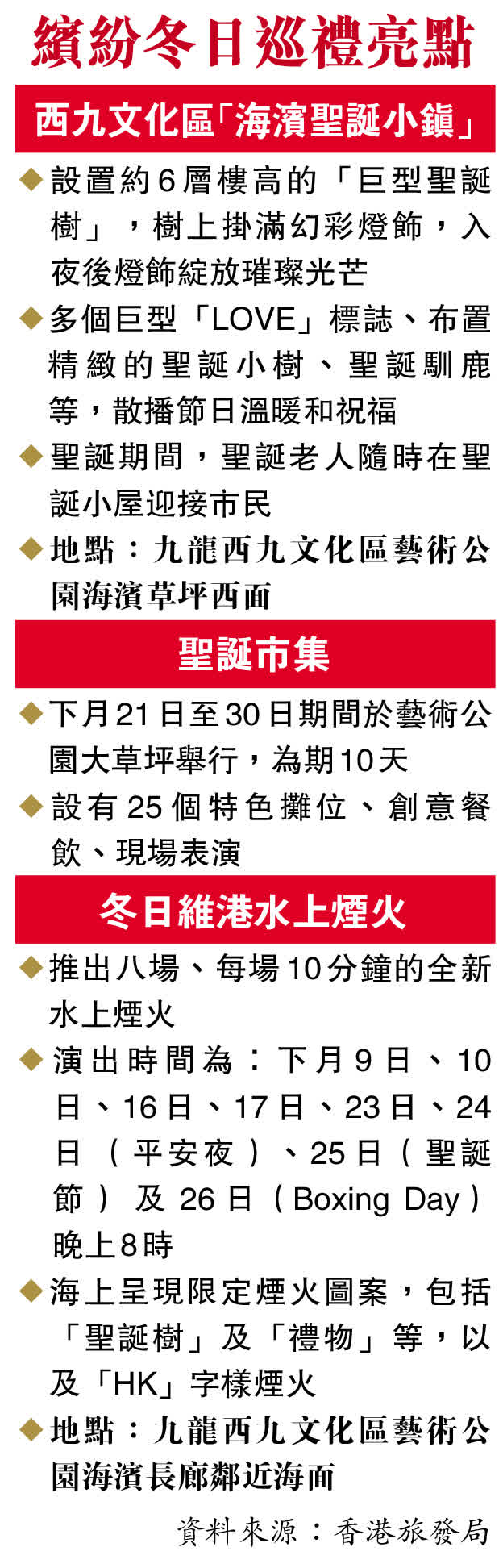 由本月24日至明年1月1日,旅發局推出「香港繽紛冬日巡禮」活動,其間會在西九文化區藝術公園海濱草坪西面設置「聖誕小鎮」,一棵高聳入雲的巨型聖誕樹矗立於小鎮中央,樹高逾20米,約有6層樓高,掛滿幻彩燈飾,樹頂更放有巨型閃耀五角星作點綴。周圍還有不同造型的小型聖誕樹、馴鹿、「LOVE」標誌等裝飾,營造濃厚聖誕氣氛。