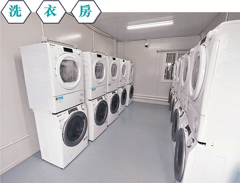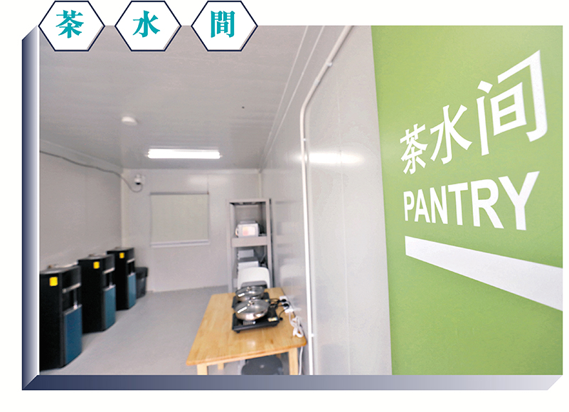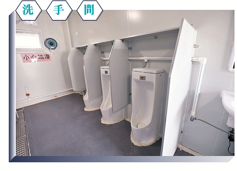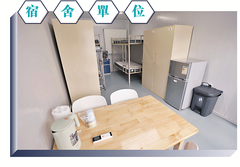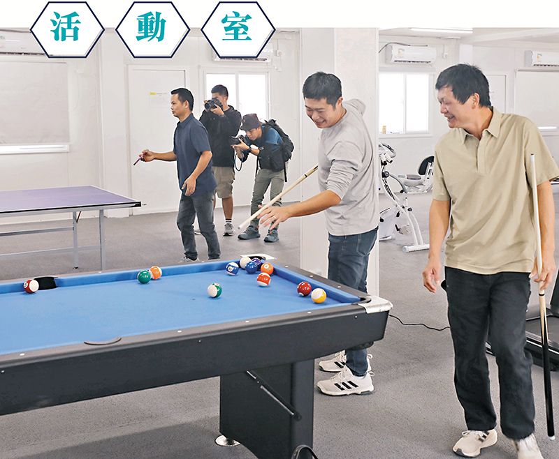 香港文匯報記者日前參觀該個由潭尾方艙設施改建而成的建造業輸入勞工宿舍,偌大的範圍排列了多幢單層高的營房。昔日安置新冠患者的房間已變身成為外勞宿舍,每個房間有4個床位,內有衣櫃、雪櫃、枱凳、冷暖空調等設備,更有Wi-Fi方便工人刷手機上網。營區內還設有不同設施如公共休息室、多功能室、茶水間等,並有跑步機、乒乓球枱和美式桌球枱,以及籃球場等,讓工人在休閒時娛樂。