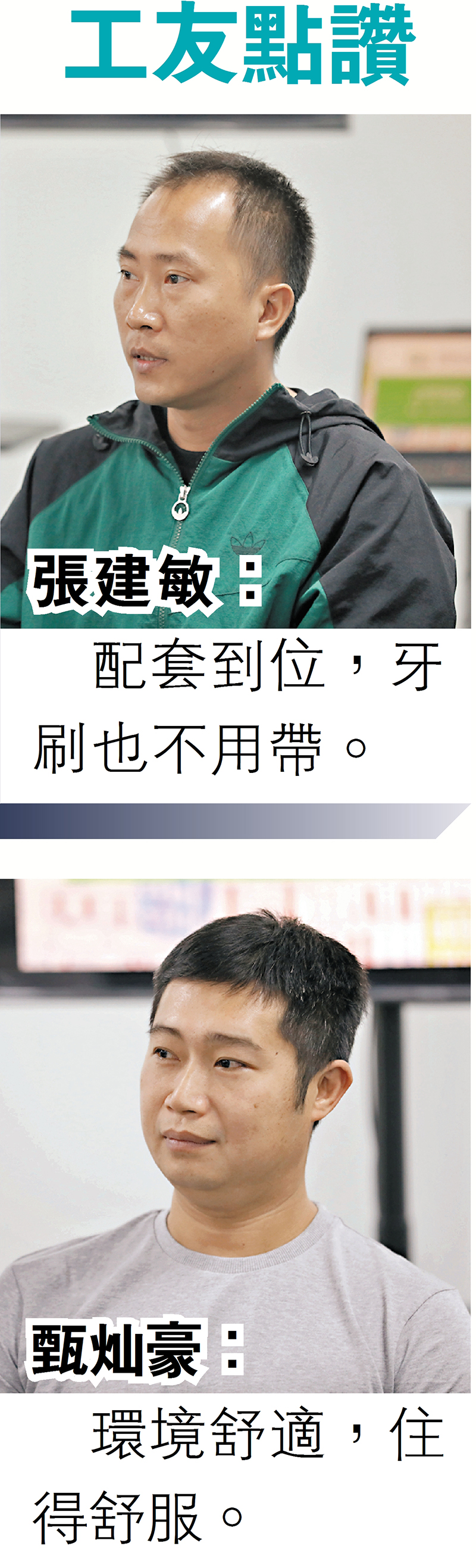 對獲安排入住潭尾方艙改建的宿舍,他們都感到十分滿意,認為宿舍環境好兼配套設施到位。張建敏表示,自己曾到內地其他省市工作,「冇宿舍要自己去租屋,現在分別好大,不用搵不用諗,到來有得住有得瞓,差好遠 ,不用自己頻撲搵房, 已安排好,牙刷也不用帶,這裏日常用品基本齊全,被和枕頭也不用買,有雪櫃、Wi-Fi,淋浴液都有。」