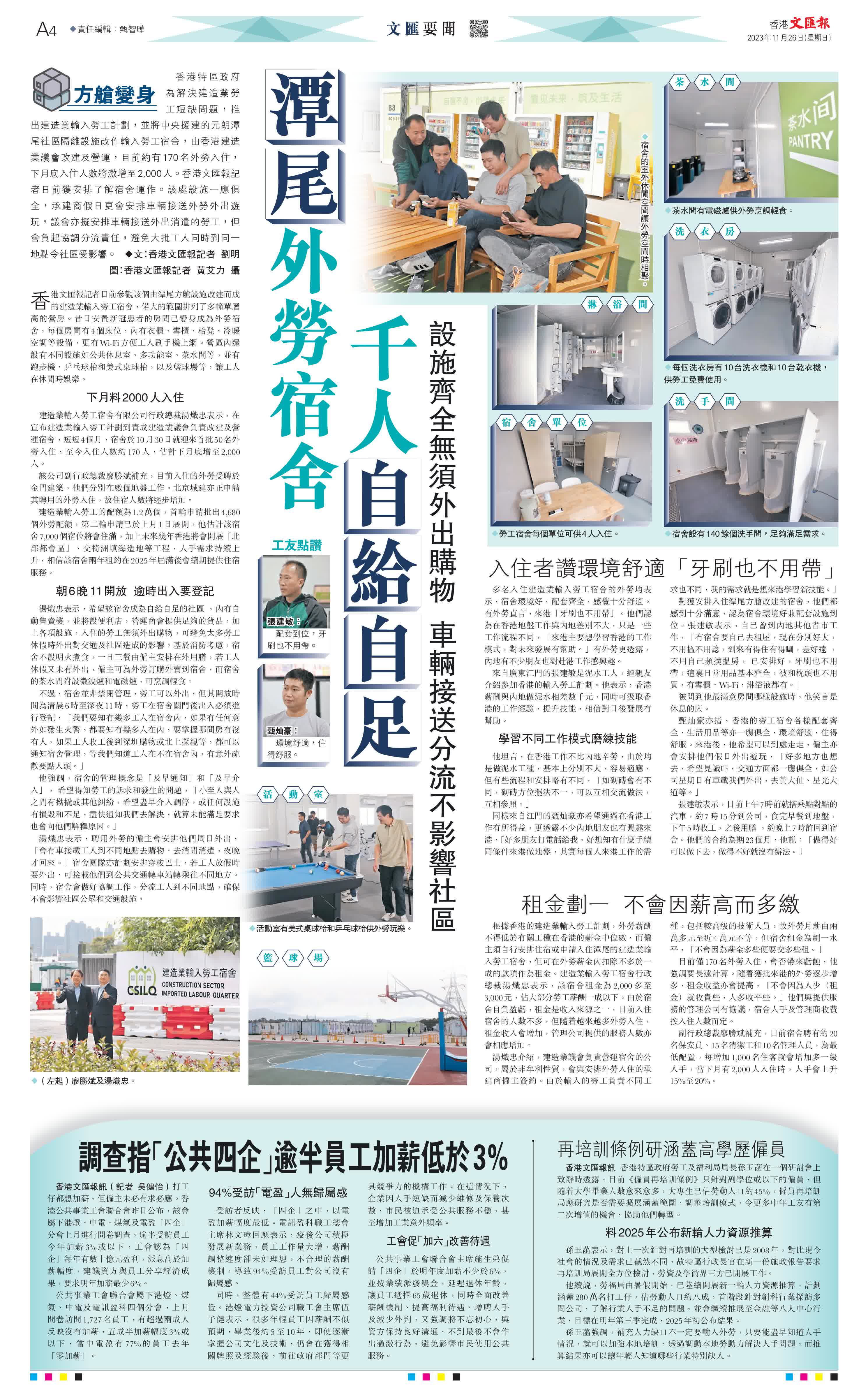 (香港文匯報記者 劉明)香港特區政府為解決建造業勞工短缺問題,推出建造業輸入勞工計劃,並將中央援建的元朗潭尾社區隔離設施改作輸入勞工宿舍,由香港建造業議會改建及營運,目前約有170名外勞入住,下月底入住人數將激增至2,000人。香港文匯報記者日前獲安排了解宿舍運作。該處設施一應俱全,承建商假日更會安排車輛接送外勞外出遊玩,議會亦擬安排車輛接送外出消遣的勞工,但會負起協調分流責任,避免大批工人同時到同一地點令社區受影響。