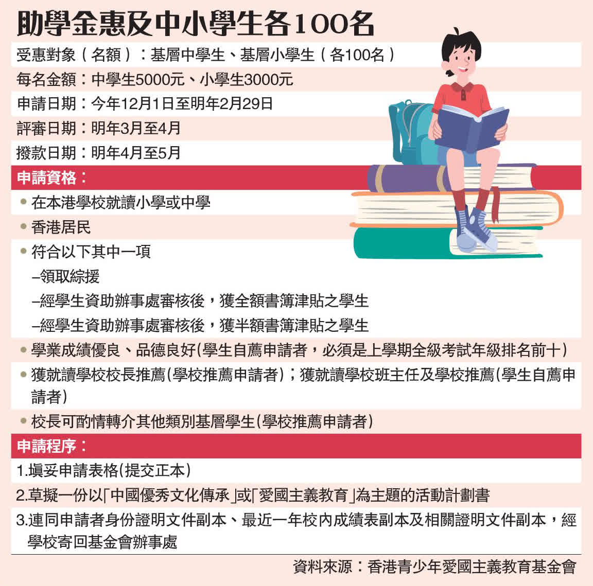 基金會主席陳鴻道致辭時表示,青少年是國家的未來和希望,也是香港的未來和希望。基金會的使命是推動國情教育,讓青年與國家發展同心同向,幫助他們在實現人生理想的路上走得更加自信。基金會正在推進兩個項目,分別是捐贈1500萬元,全力響應並支持特區政府惠民生、添幸福等各方面的工作;另外正籌備推出助學金(見表),為基層家庭中、小學生提供學習資助,讓青年人深入了解中國歷史、文化、傳統價值觀、國家安全及國防等課題。