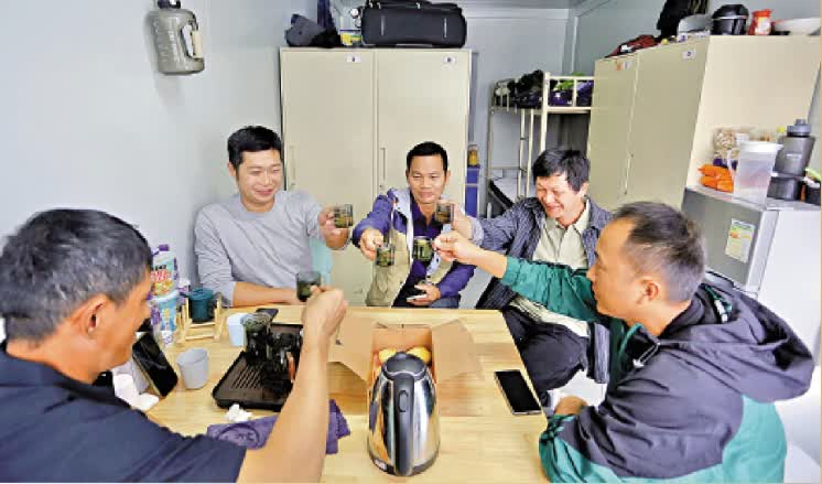大公報記者上周走訪宿舍,見到維持昔日方艙的大致布局,但組合屋已改變功能。最讓人印象深刻的是由幾個組合屋打通而成的活動室,內有桌球枱、乒乓球枱、跑步機及健身單車等設施,數位工友在打桌球,有工友在打乒乓球賽。宿舍的公共休息區設有販賣機,有人工草坪和附有遮陽傘的桌椅,據工友說,不時在這裏聊天放鬆。宿舍內正在建造籃球場,供工友到此打球。茶水間有飲水機、微波爐和電磁爐,可供工友簡單煮食。