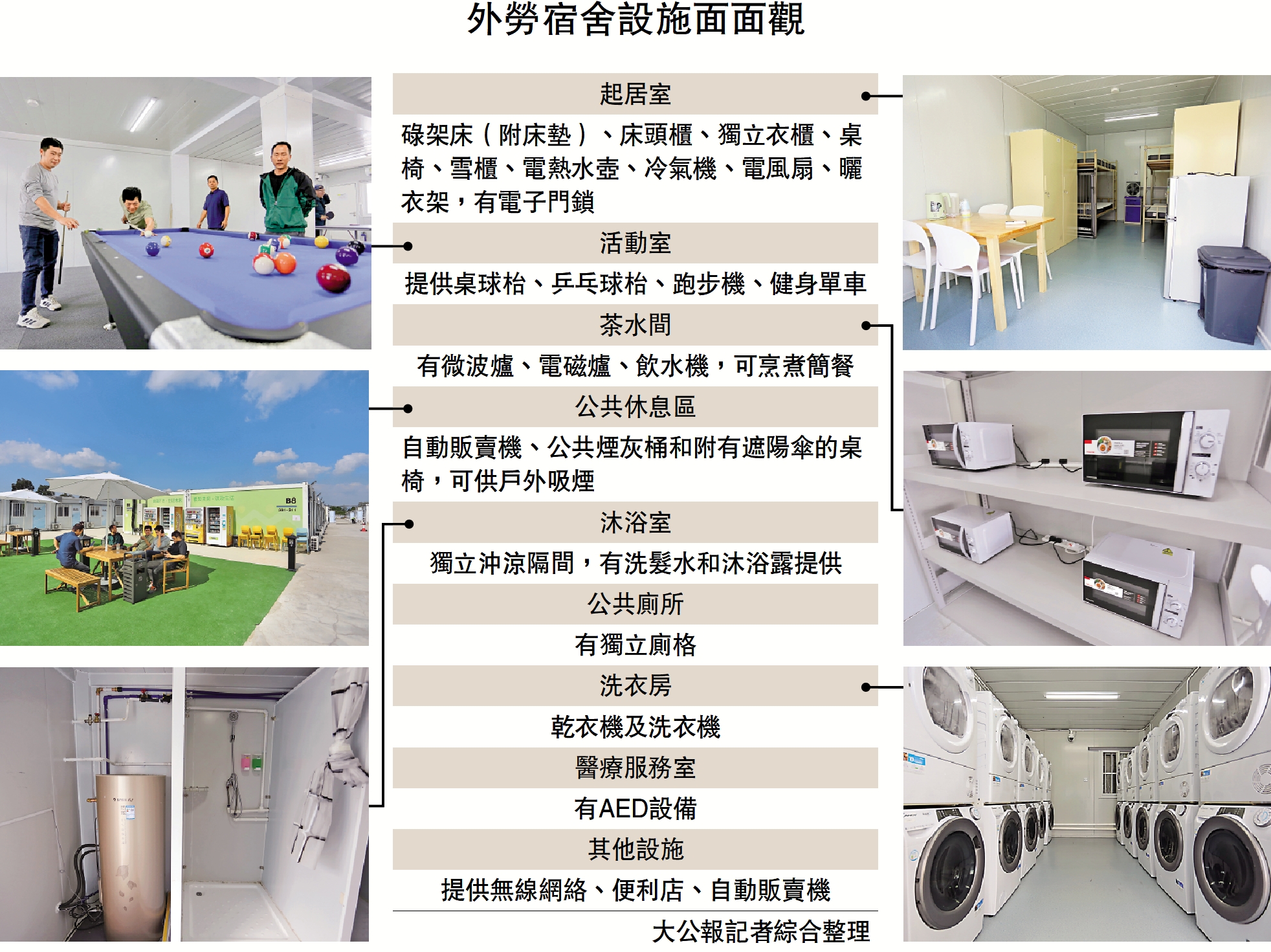大公報記者現場考察所見,宿舍內的生活設施俱全,並提供活動室、桌球枱等康樂設施,有工友形容可以「拎包入住」。負責宿舍改裝及營運的建造業議會表示,發展局善用社區隔離設施,改裝工程在兩個月內快速完工,得益於原有設施完備,居住條件也更好。宿舍於上月底正式使用,現有約170名輸入勞工入住,預計今年底增至約2000人,為建設更美好香港注入動力。