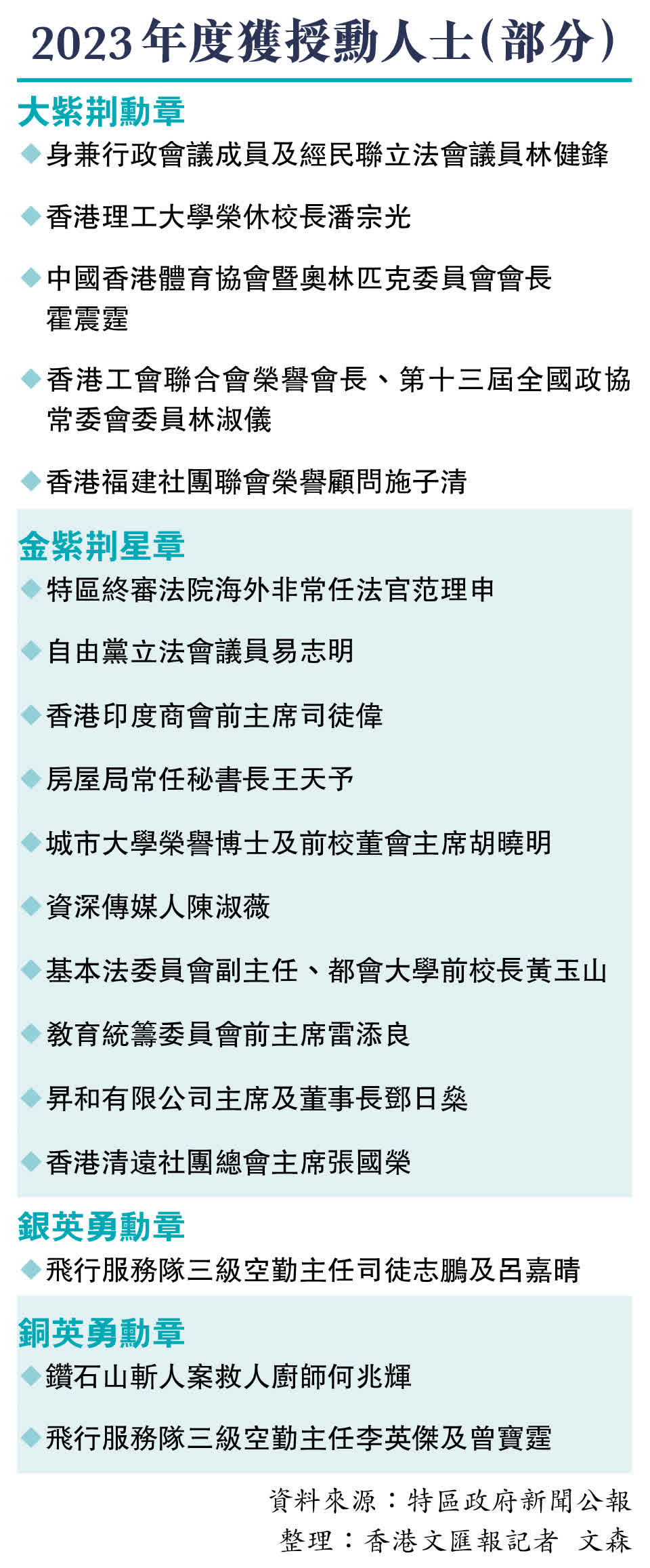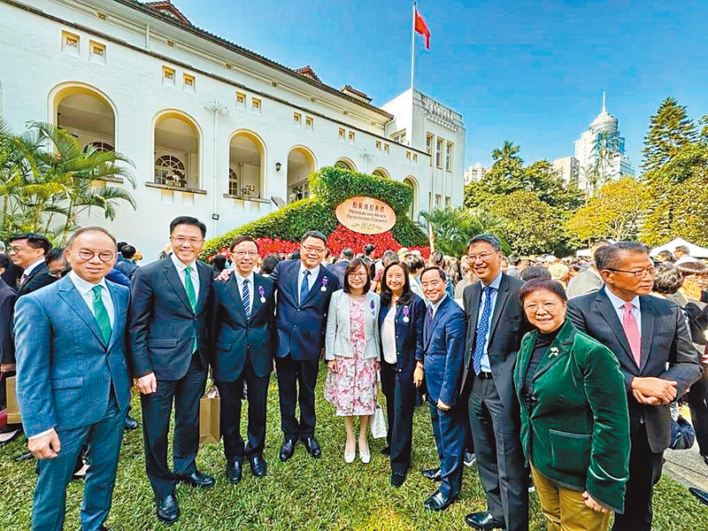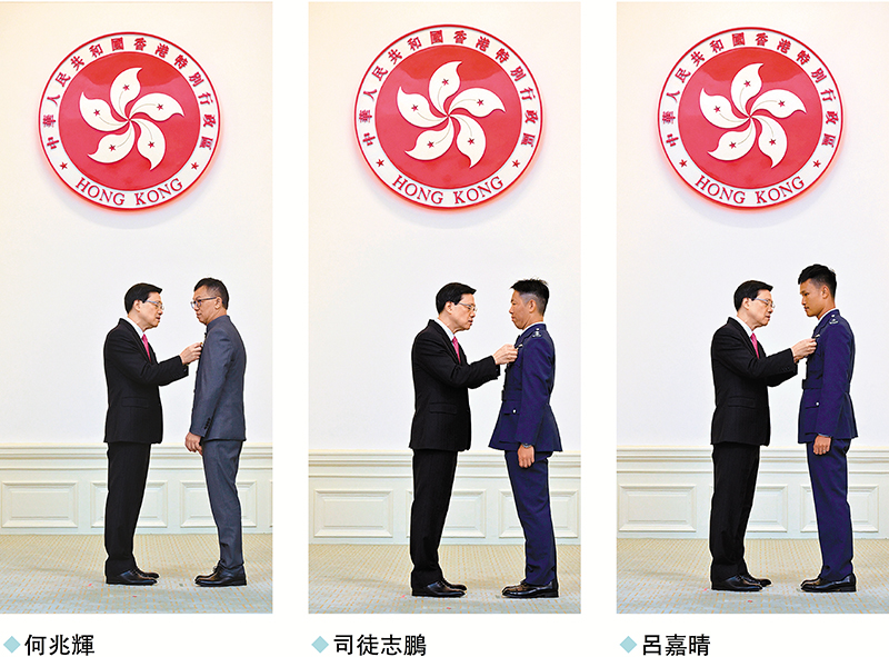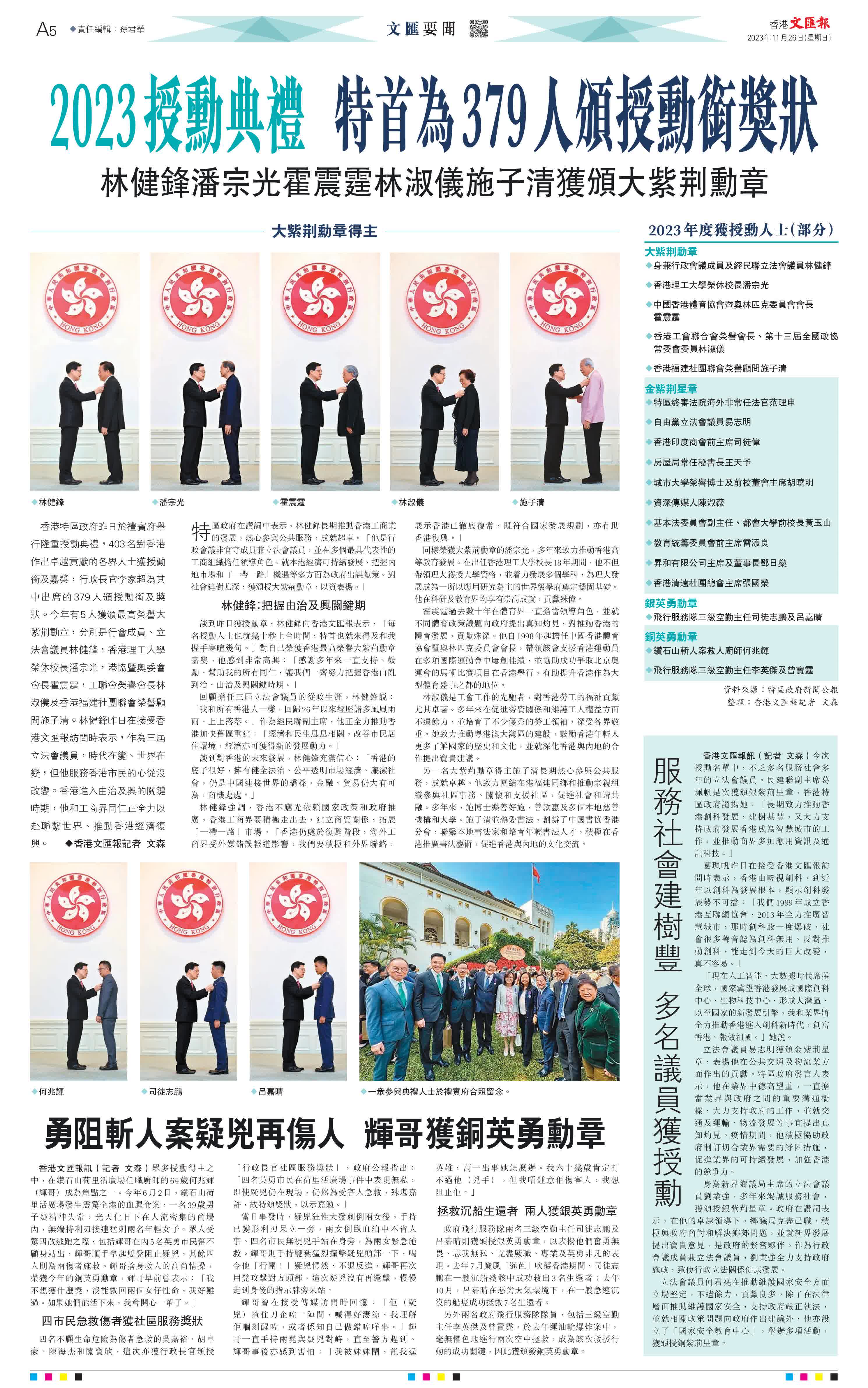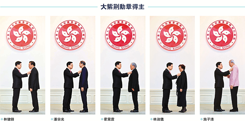 (香港文匯報記者 文森)香港特區政府昨日於禮賓府舉行隆重授勳典禮,403名對香港作出卓越貢獻的各界人士獲授勳銜及嘉獎,行政長官李家超為其中出席的379人頒授勳銜及獎狀。今年有5人獲頒最高榮譽大紫荊勳章,分別是行會成員、立法會議員林健鋒,香港理工大學榮休校長潘宗光,港協暨奧委會會長霍震霆,工聯會榮譽會長林淑儀及香港福建社團聯會榮譽顧問施子清。林健鋒昨日在接受香港文匯報訪問時表示,作為三屆立法會議員,時代在變、世界在變,但他服務香港市民的心從沒改變。香港進入由治及興的關鍵時期,他和工商界同仁正全力以赴聯繫世界、推動香港經濟復興。