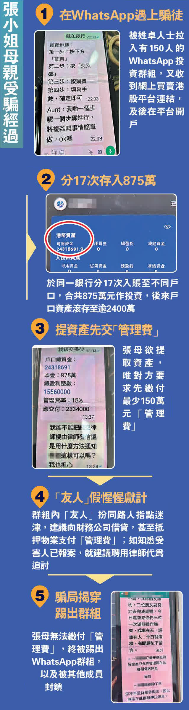 張小姐表示,在今年10月,卓透過WhatsApp向張母提供一條連結,聲稱為買賣港股的網上平台,及後母親於平台開立戶口,並於10月初至11初期間,在同一間銀行分17次入賬到不同戶口,合共875萬元以作投資。11月時,張母網上平台的賬戶顯示,股票價值約2400萬元,卓及相關人士游說她投資較這金額更高的股票,並叫她繳付相關近百萬元的差額,惟張母無法付款,對方竟再要求她繳付50萬元「管理費」以保留相關交易。張小姐表示,母親因耗盡儲蓄遲遲未能繳交「管理費」,欲取回戶口款項,惟對方竟告之須先繳付最少150萬「管理費」才可啟動。張母最終因無力繳付「管理費」,遭卓及有關WhatsApp群組封鎖。張小姐及家人得悉情況後,於11月11日與母親往警署報警。