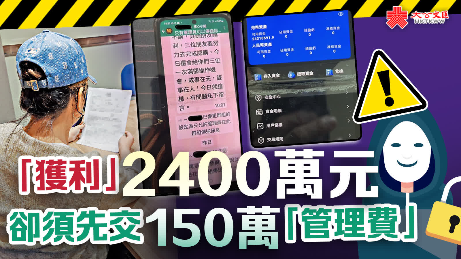 大公報記者專訪受害人家屬,深入了解騙徒手法。受害人為70多歲長者,受一群所謂「股壇高手」誘騙加入被「防騙視伏器」定為「高危有伏」的股票投資平台,她傾盡近900萬元積蓄購買股票,雖然賬面「獲利」,惟當受害人要提取款項,卻須先繳付最少150萬「管理費」,有如JPEX騙案翻版。騙徒更布局「騙上騙」,當首個騙局被揭穿,群內網友紛紛扮好人「出謀獻策」,包括找律師協助追討或向財務公司借貸等,炮製下一個騙局,榨盡受害人一分一毫!