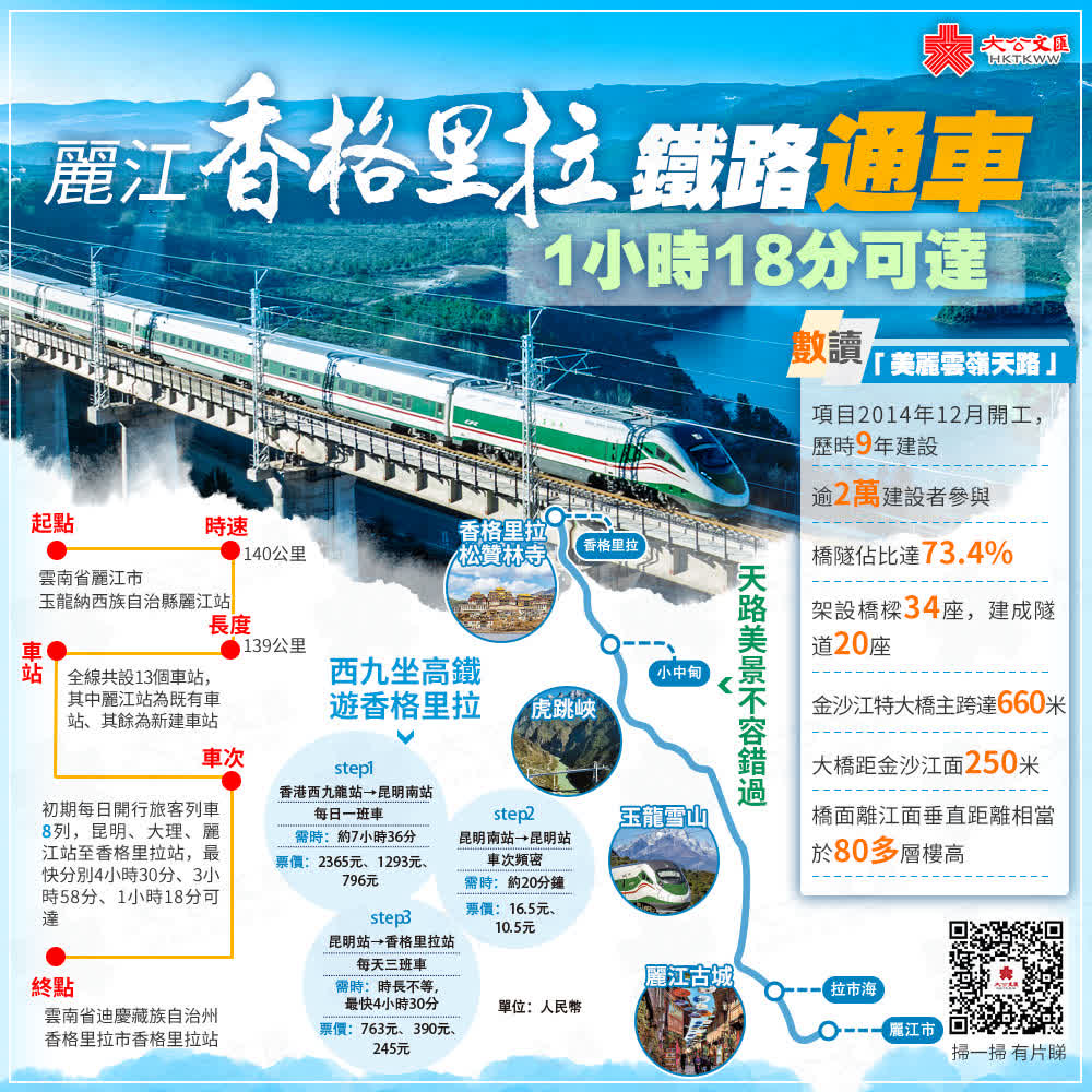 大公報綜合新華社、記者譚旻煦報道,11月26日,復興號動車組從雲南迪慶藏族自治州香格里拉站開出,向麗江方向駛去,標誌着麗江至香格里拉鐵路開通運營。迪慶州結束不通火車的歷史,自香格里拉乘火車最快1小時18分鐘即可到達麗江,5小時以內就可到達雲南省會昆明。當日上午,開通儀式在香格里拉車站進行,各族群眾身着盛裝、載歌載舞,共慶雲嶺築就新天路,為各族兒女帶來幸福吉祥。分析指,麗香鐵路開通將有利推動川渝滇藏更好地融入「一帶一路」,接軌中老鐵路通往更廣大的市場。