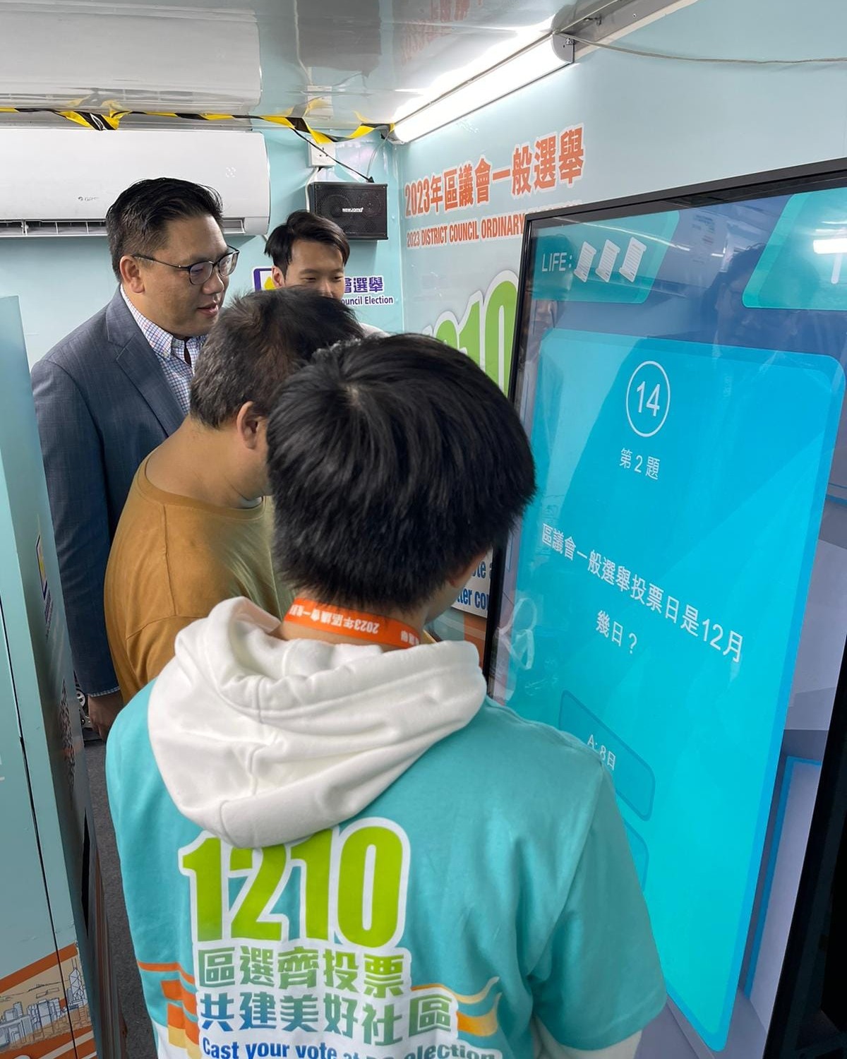 政制及內地事務局局長曾國衞早前分別到堅尼地城卑路乍灣海濱長廊及灣仔海濱的「區選夜繽紛」,與市民互動及玩遊戲;民政事務局局長麥美娟和多名副局長先後到訪設於紅磡市政大廈體育館、觀塘社區中心、青衣西南體育館及鯉魚門體育館等的「區選進社區」流動遊戲攤位;財經事務及庫務局局長許正宇則到訪奧海城二期的親子工作坊及展覽。一眾官員在活動現場派發宣傳單張和紀念品,宣傳「1210區選齊投票」的訊息,呼籲選民於投票日選出心儀的候選人,共建美好社區。