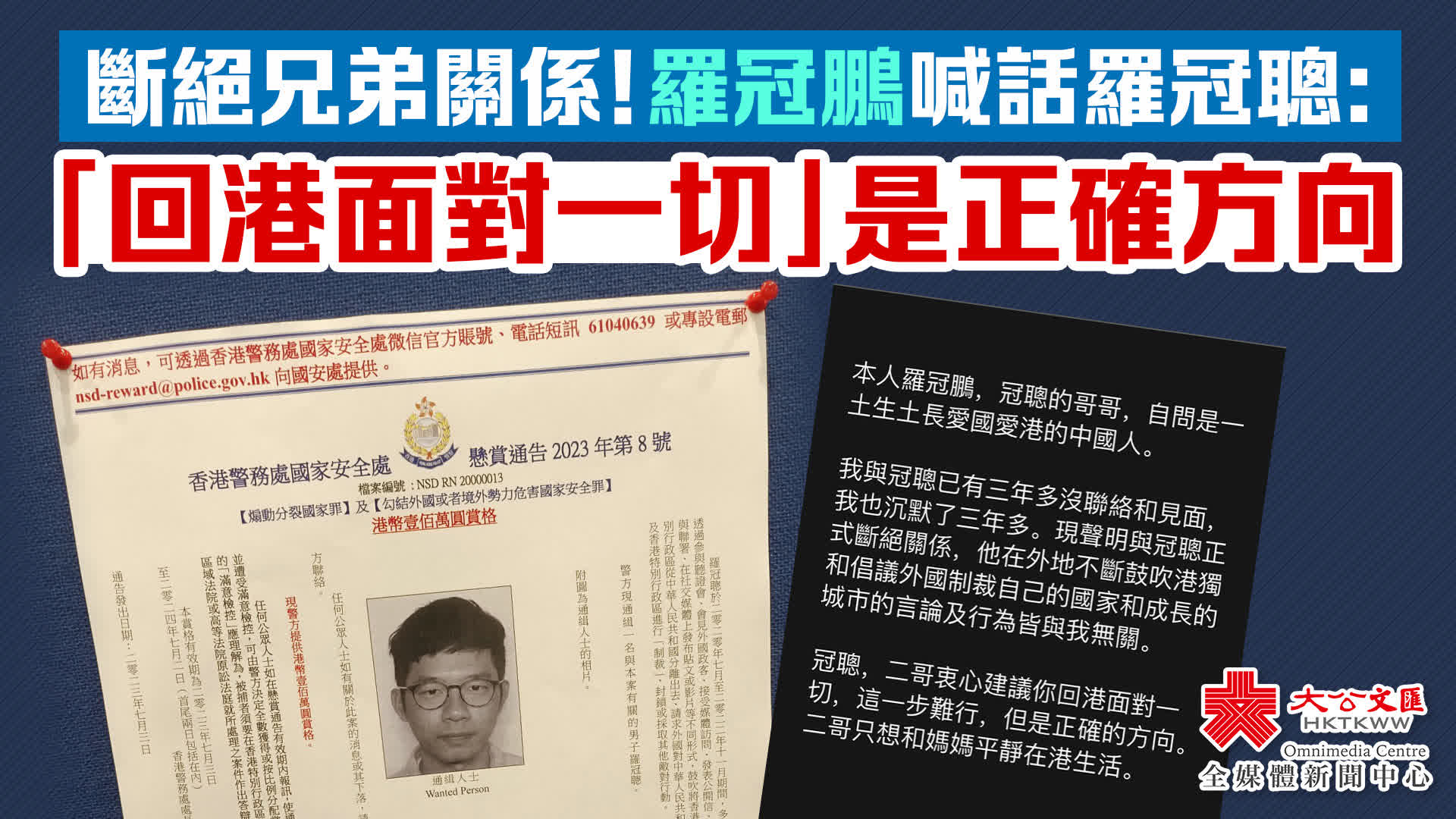 大公文匯全媒體報道,正受國安通緝的反中亂港分子、前「香港眾志」創黨主席羅冠聰劣跡斑斑,其二哥羅冠鵬今(27日)晚疑發文指和羅冠聰正式斷絕關係,並希望羅冠聰回港面對一切,才是「正確的方向」。