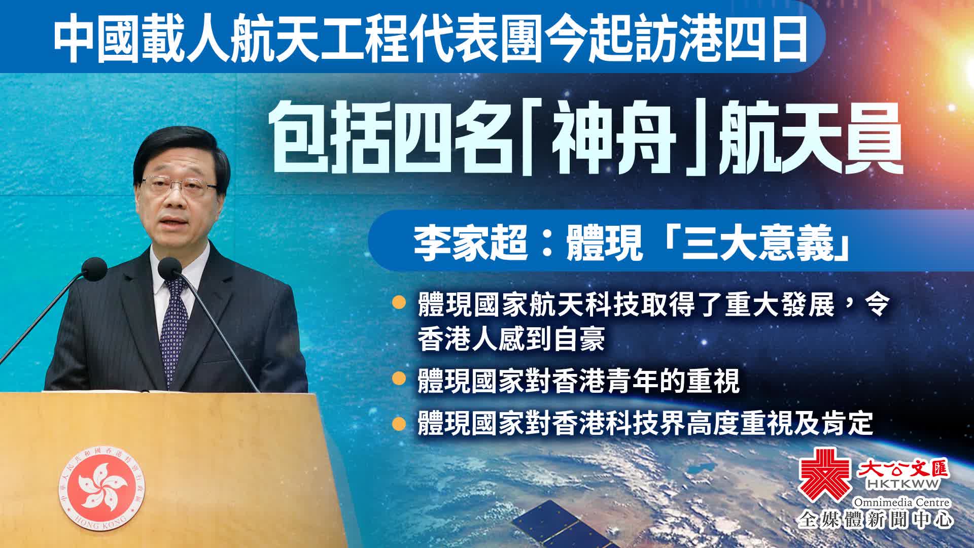 李家超指出,代表團在港四日期間會出席多項活動,其中代表團明日下午會出席在香港體育館舉行的「全港歡迎中國載人航天工程代表團大匯演」。