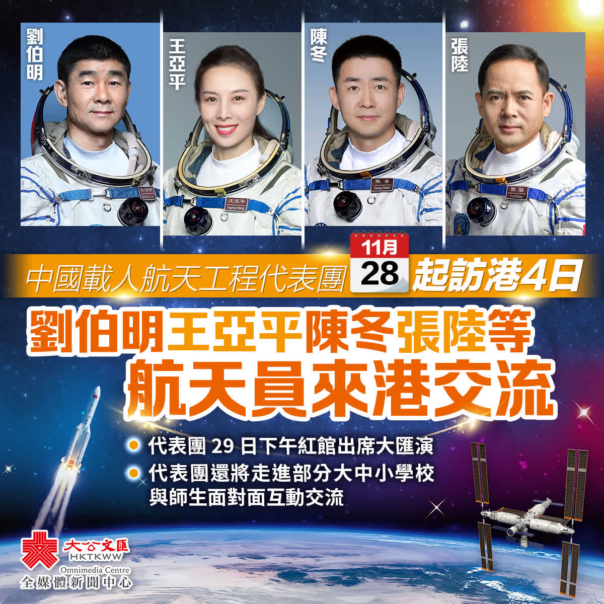 大公文匯全媒體報道,據中國載人航天工程辦公室消息,應香港特別行政區、澳門特別行政區政府邀請,載人航天工程代表團將於2023年11月28日至12月3日赴香港、澳門進行為期6天的訪問。