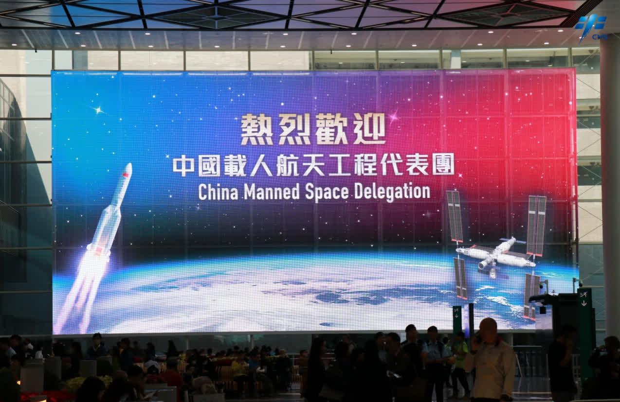 香港特區政府在機場舉行了熱烈的歡迎儀式。中國載人航天工程辦公室副主任、代表團團長林西強,執行空間站建造任務的神舟十二號乘組、神舟十三號乘組、神舟十四號乘組、神舟十五號乘組航天員代表劉伯明、王亞平、陳冬、張陸率先步出機場大廳。香港特區政府政務司司長陳國基、民政及青年事務局局長麥美娟等政府官員到機場迎接。百餘名香港小學生們在現場揮舞着五星紅旗和紫荊花區旗,熱情歡迎代表團的到來。