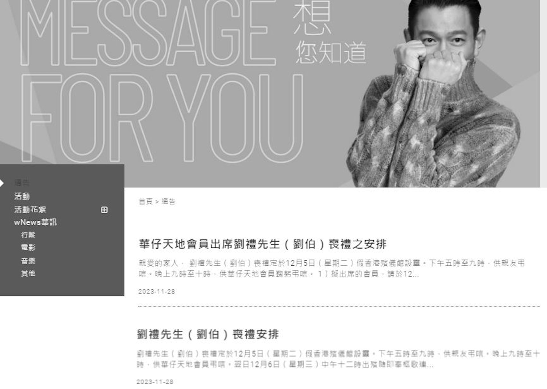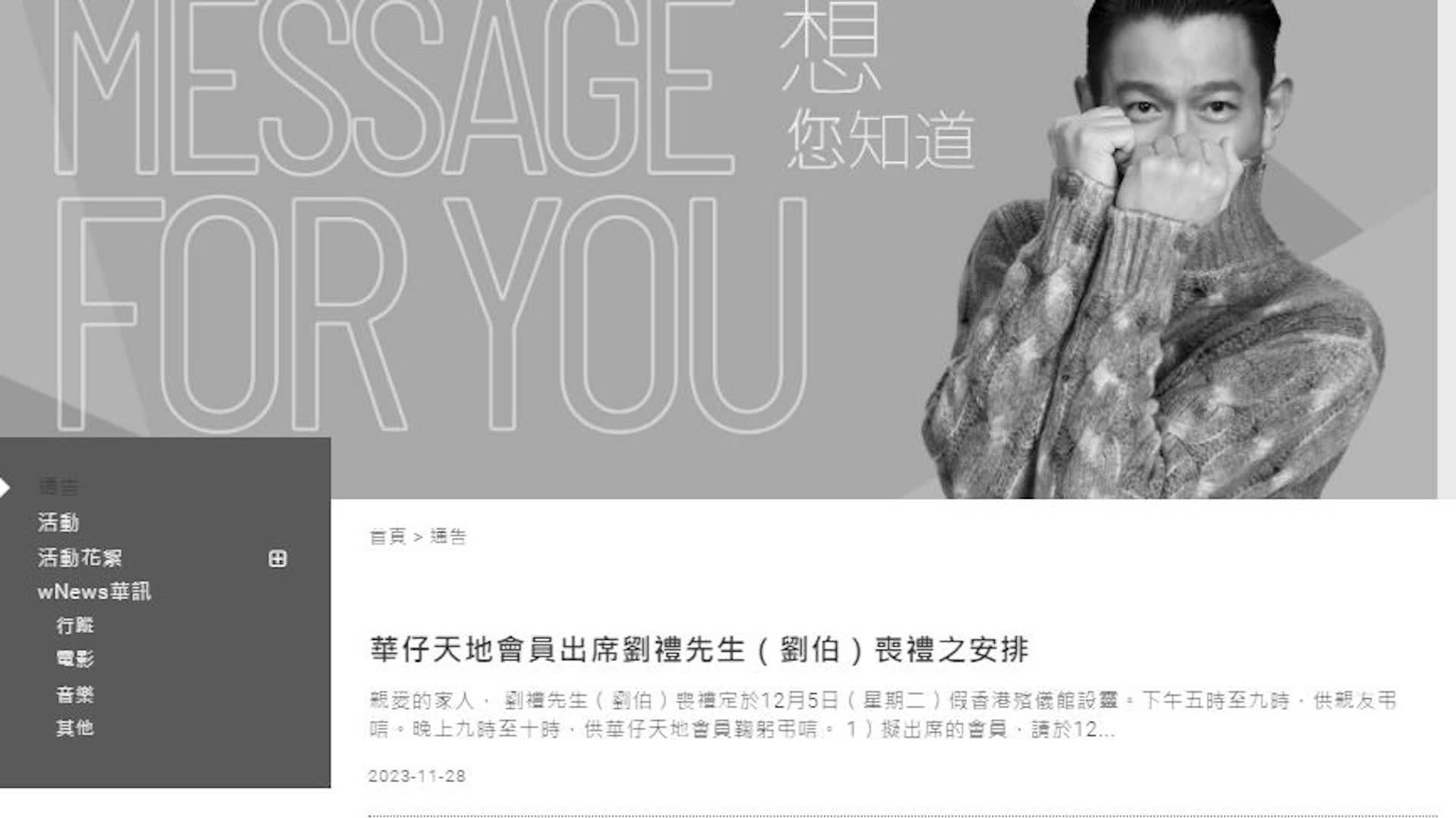 大公文匯全媒體報道,天王劉德華早前在「華仔天地」華博悲痛宣布丁父憂:「父親於20號在家人陪伴中安詳離開了。」而華博轉為黑白色界面以悼念劉父,「華仔天地」今日(28日)公布劉父後事安排詳情。