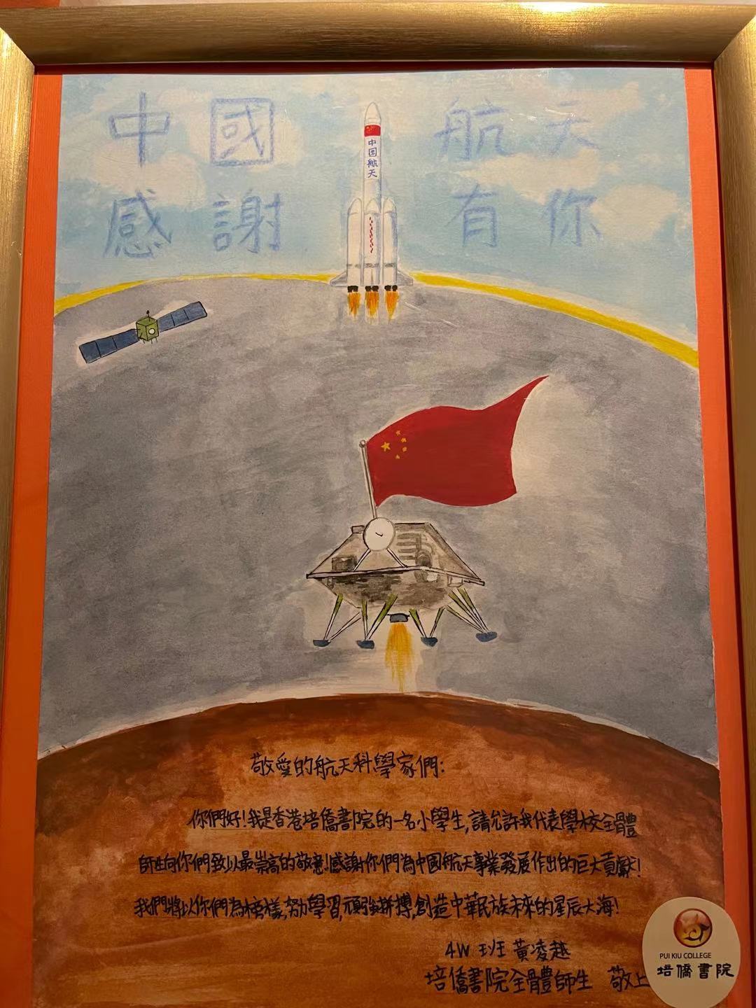 培僑書院學生親製畫作感謝航天團。培僑書院4W班學生黃凌越和培僑書院其他師生一起,共同向國家航天科學家團隊送上了親手製作的畫作。畫作除繪上中國航天工程的多個模型和五星紅旗外,還寫上「中國航天 感謝有你」以表達對國家航天科學家團隊的感謝。