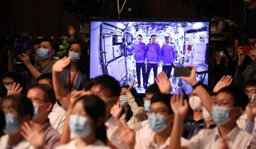 2021年9月3日,「太空出差三人組」——神舟十二號航天員聶海勝、劉伯明和湯洪波與香港青年學生代表實時「天地對話」。航天員們與香港的學生進行了精彩的對答,並當場演示了太空踩單車及耍太極,以及在太空中如何飲水。航天員精彩的演示不時贏得現場觀眾的振振掌聲。