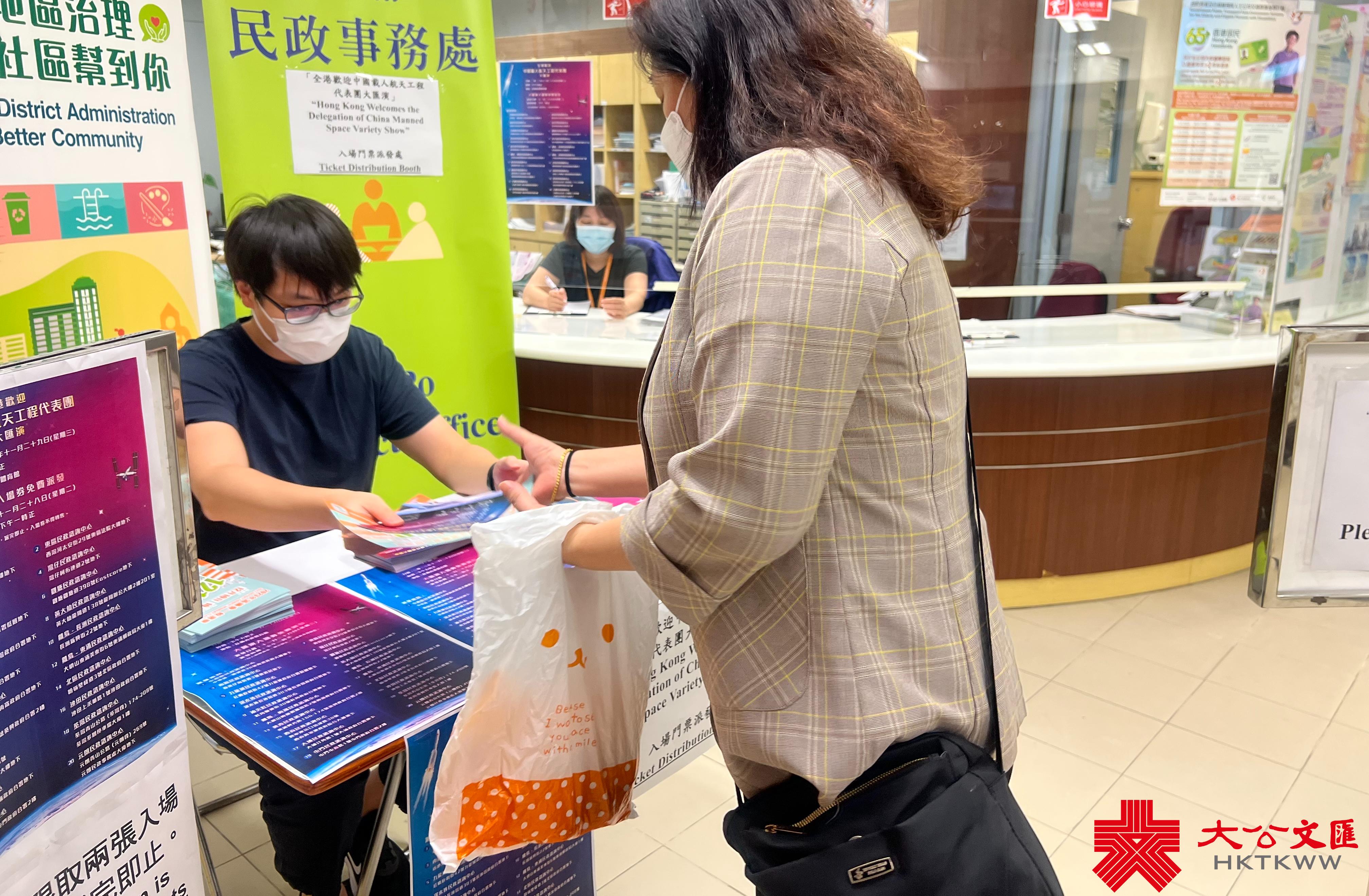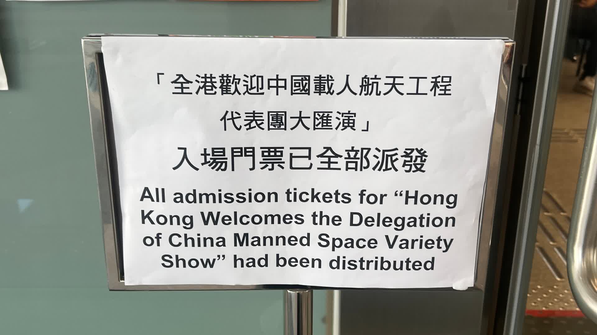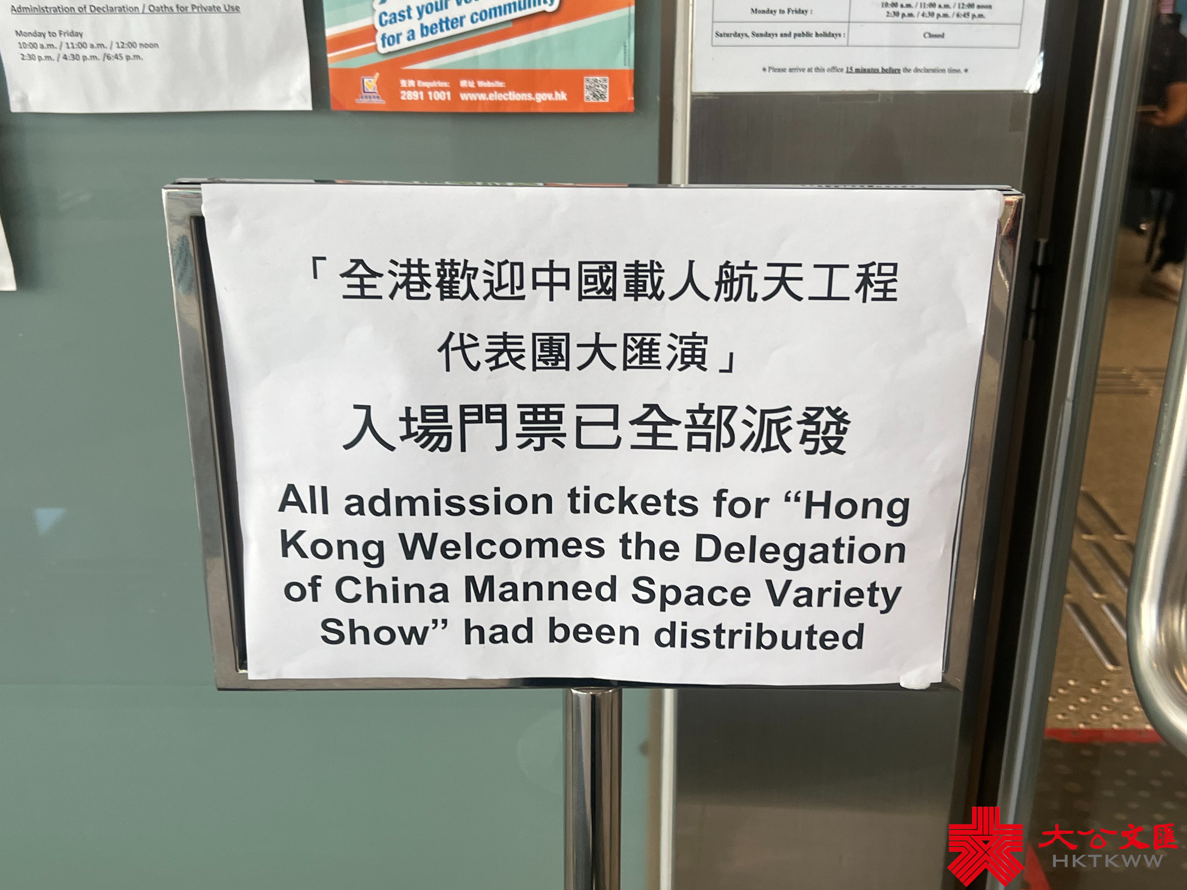 大公文匯全媒體報道,應特區政府邀請,中國載人航天工程代表團今日(28日)抵港,進行4天的訪問。代表團亦將出席在香港體育館(紅館)舉行的「全港歡迎中國載人航天工程代表團大匯演」。民政事務總署最新宣布,「全港歡迎中國載人航天工程代表團大匯演」的免費門票已經全部派出。