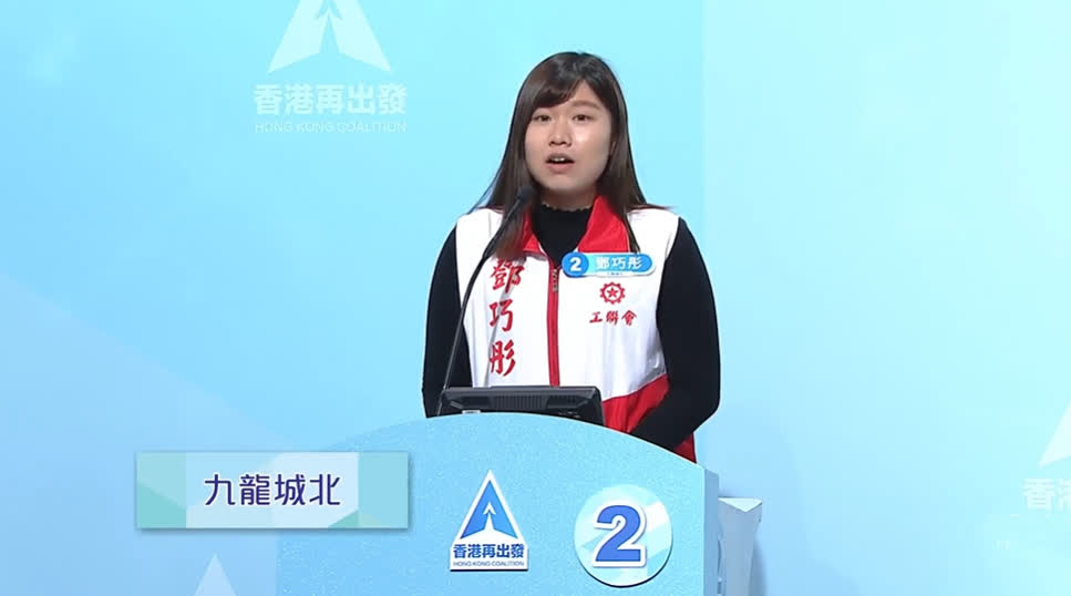被問到交通問題,2號候選人鄧巧彤提及,九龍城有許多違泊情況,需要執法部門加強巡查,而且當局要推出更多誘因,鼓勵市民乘搭公共交通工具。她續稱,自己關心社區各類議題,例如,促請政府增加託兒場所的選擇,降低價格,釋放婦女勞動力;擴大樂齡科技的使用,為長者添置隨身攜帶的平安鐘等等。