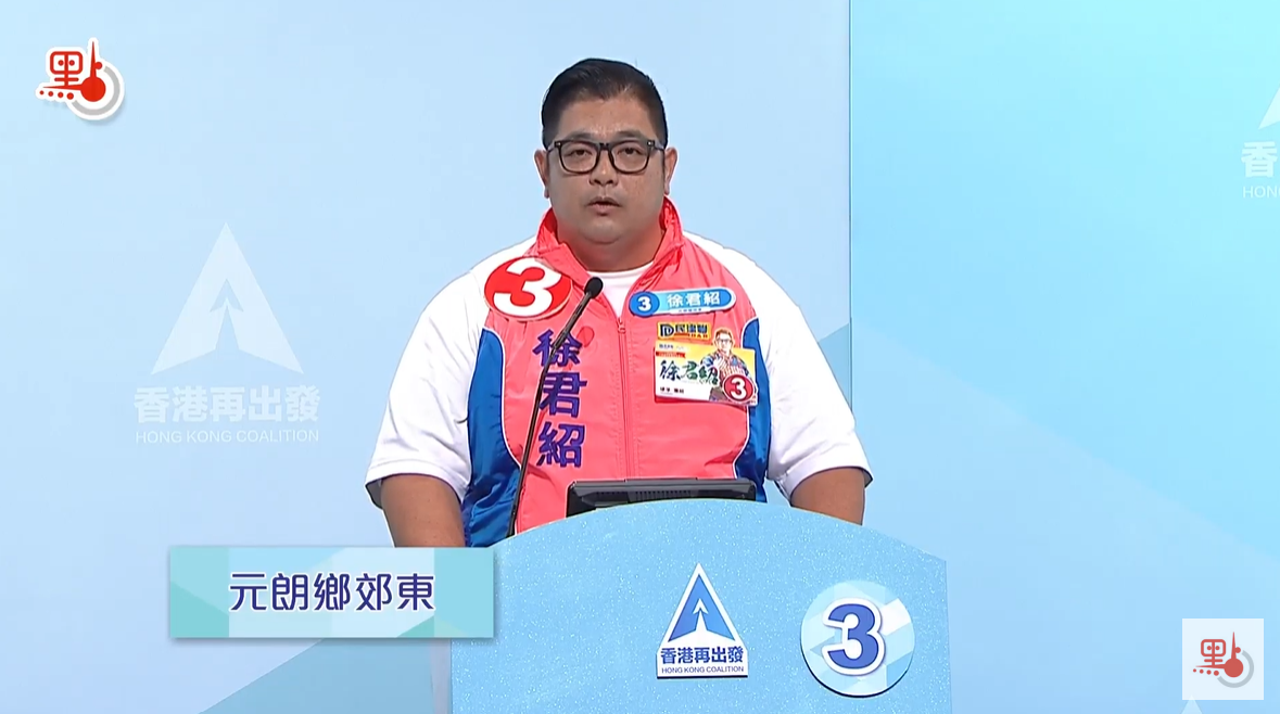 對於環境衞生問題,3號候選人徐君紹指,鄉郊有非法傾倒問題,涉及不同部門管轄的土地,因此,政府有必要加強跨部門協作。他特別強調,打擊非法傾土,要增加罰則、優化通報機制等。徐君紹表示,自己有廿年地區服務經驗,亦有團結、硬淨的民建聯團隊支援,他有信心在元朗發展過程幫助市民排憂解難,建設更美好的元朗。