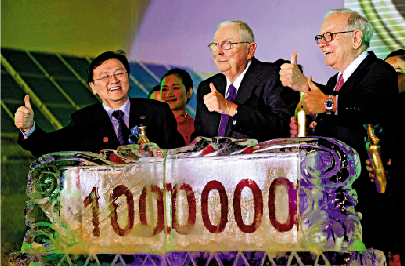 巴菲特遵循「永遠不要投資你不熟悉的行業」的原則,起初對投資比亞迪持懷疑態度。但芒格看好比亞迪,最終說服巴菲特於2008年讓巴郡公司進行投資。當時巴郡通過旗下的中美能源控股公司以18億港元購入比亞迪股份,每股價格為8港元。芒格在2009年的股東大會上說:「比亞迪可能是一家小公司,但它有很大的野心。能夠與比亞迪這樣的公司合作是我最大的榮幸。」本月28日,比亞迪收市價已升至每股219港元。芒格早前說,巴郡投資比亞迪獲得了一筆巨大財富,並稱讚這家公司聚集了很多有才華的人。