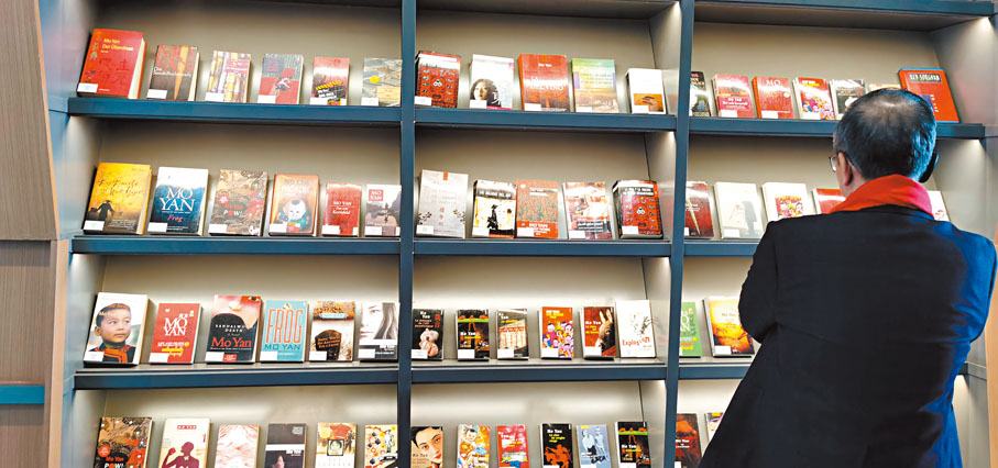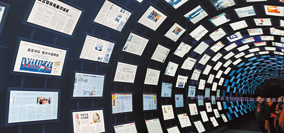 在莫言文學藝術館內,有一個專門陳列有關作家新聞報道的單元。在這一展區的醒目位置,記者看到了2012年10月12日當天出版的香港文匯報。當天的香港文匯報頭版用豎體大字標記了頭條文章的標題——「中國本土作家第一人——文學諾獎莫言折桂」。頭版的另一篇文章則以《欣喜獲獎 筆耕不輟》為題,記述了作家本人獲獎後的狀態。還有其他版面包括《成就獲肯定 世界注視中國》、《著作熱銷 京滬魯斷貨》、《莫言感言:榮歸文學》、《「莫焰」高漲 洛陽紙貴》、《農家小院 走出巨匠》、《田野『紅』雖去 故鄉名漸高》等文章,全面生動細緻地報道了作家榮獲諾獎後的盛況。香港文匯報記者注意到,在展覽現場,這些當年的報紙版面一一被陳列出來,並引來許多參觀者駐足圍觀。
