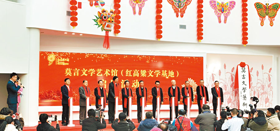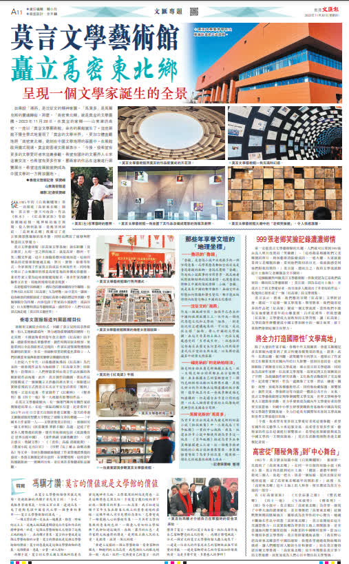 (香港文匯報記者 張寶峰 山東高密報道)如果說「湘西」是沈從文的精神家園,「馬貢多」是馬爾克斯的靈魂歸宿,那麼,「高密東北鄉」就是莫言的文學圖騰。2023年11月28日,在莫言的家鄉——山東濰坊高密,一座以「莫言文學藝術館」命名的展館誕生了。這座展館不僅全景式地重現了「莫言的文學世界」,更加立體直觀地將「高密東北鄉」銘刻在中國文學地理的版圖中。在展館啟用儀式現場,莫言對香港文匯報表示,「今後,我希望有更多的文學愛好者來這裏參觀,希望有國外的文藝界人士來這裏交流,也希望有更多作家、藝術家的作品在這裏進行展覽展示,希望這座展館能夠成為中國文學的一方開放園地。」