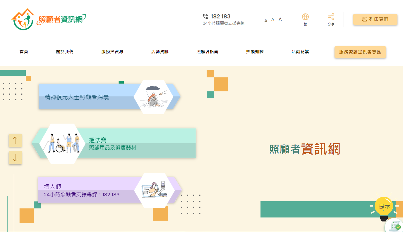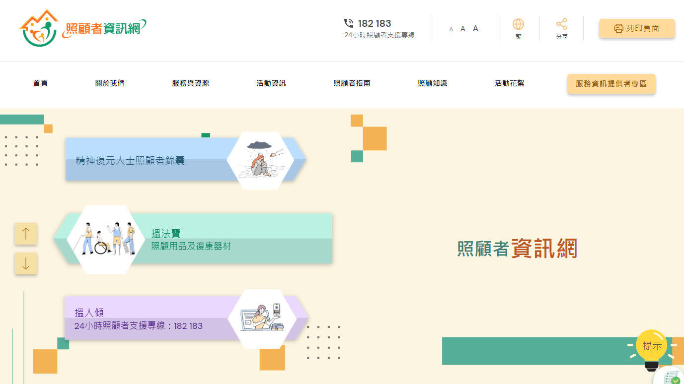 資訊網的內容涵蓋為長者、殘疾人士、精神復元人士、特殊學習困難兒童及其照顧者提供的服務、照顧技巧,以及為照顧者提供的社區活動和資源等。網站已連結照顧者支援專線182 183和暫託服務/緊急住宿空置名額查詢系統,便利照顧者隨時尋求支援。