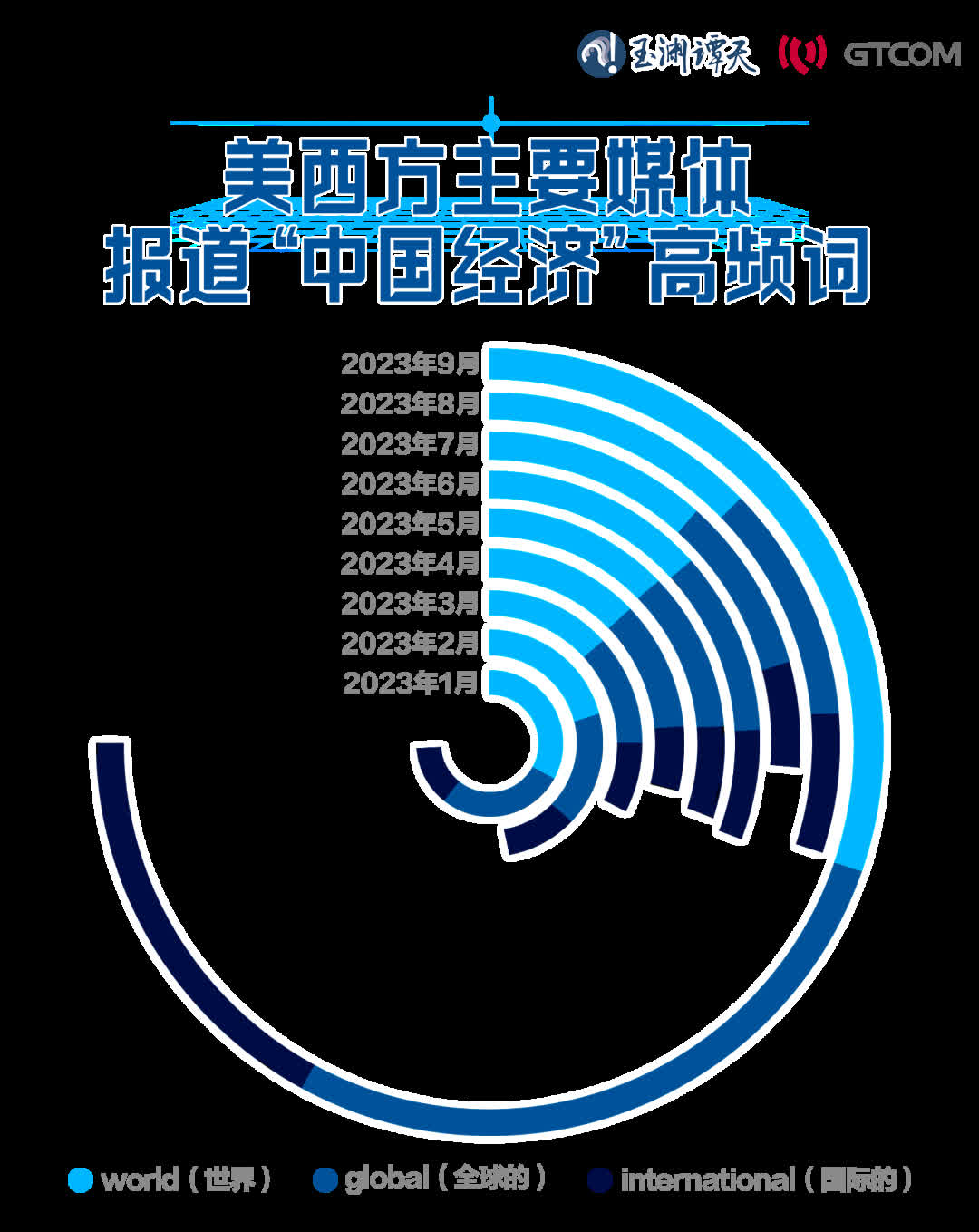 今年以來,外媒在關注中國經濟時,一個典型特徵,就是勾連中國經濟與大環境的關係。譚主用大數據工具進行統計發現,1月至9月,外媒使用「世界」「全球的」「國際的」這三個詞的頻次在逐步增加。