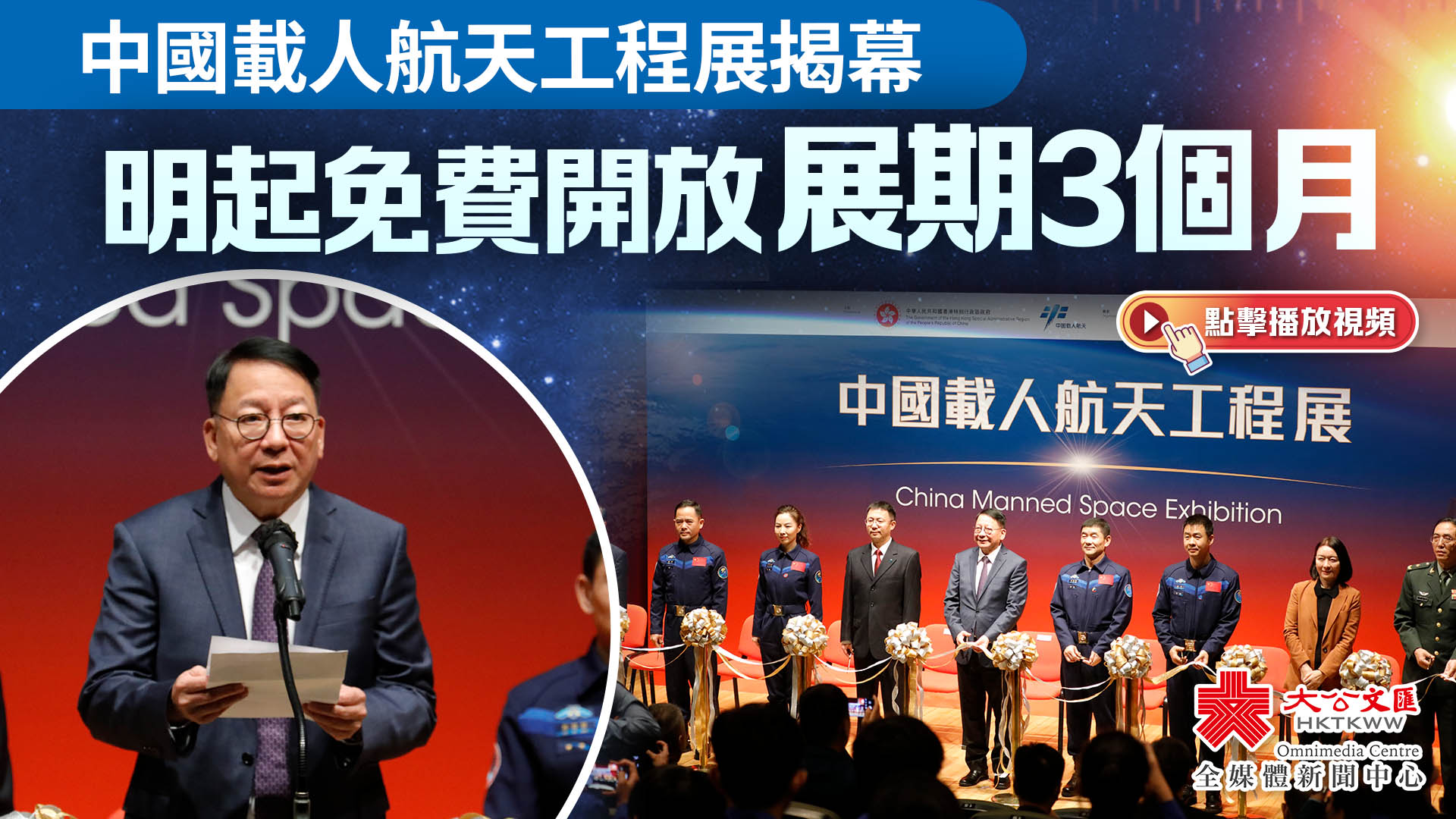「中國載人航天工程展」將於12月1日至明年2月18日,在香港科學館二樓展覽廳及香港歷史博物館一樓大堂舉行,向公眾免費入場。展覽分為兩大展區,位於香港歷史博物館的展區以中國載人航天發展史為主軸,帶大家回顧三十年來奮鬥圓夢的輝煌歷程;而香港科學館的展區則展示工程方面的成就,以及對未來發展的展望。