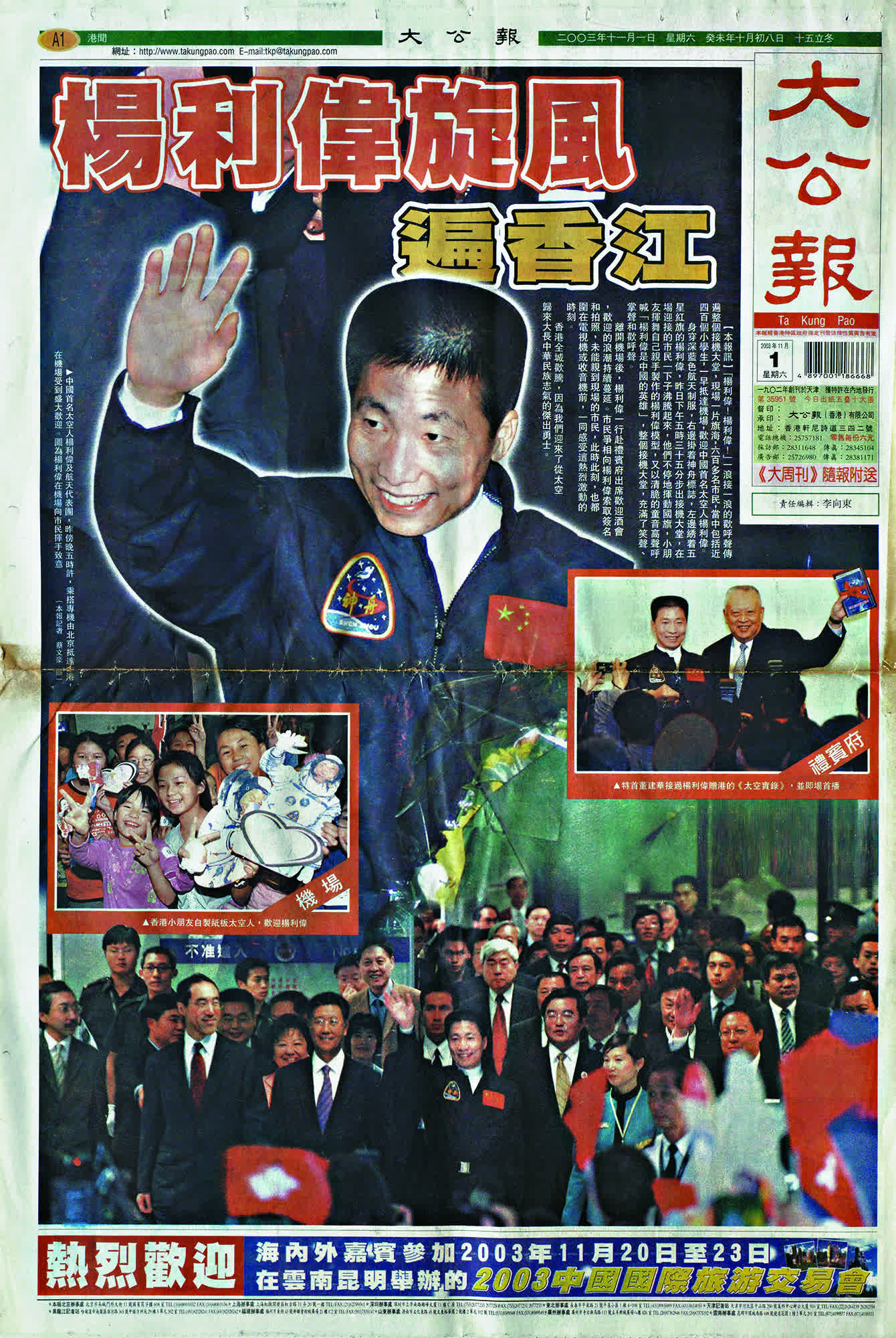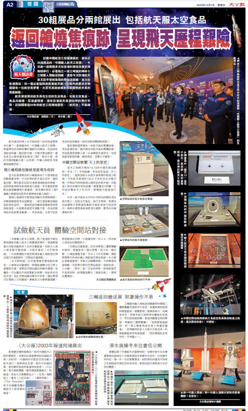 香港歷史博物館展出一系列中國航天工程的發展史,並展出記錄重要時刻的報紙文章。2003年,中國神舟五號首次成功載人航天飛行,搭乘神舟五號一飛沖天的楊利偉,當年應特區政府邀請來訪香港。《大公報》當日頭版標題「楊利偉旋風遍香江」的報道,成為今次展覽展品之一。在同一塊展板上,還有《人民日報》、《環球時報》、《The Guardian》等中外媒體有關中國航天工程發展的報道。