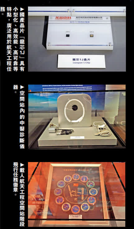 航天工程展亦展出1比15的中國空間站模型,並呈「T」字型結構,李為君形容是「天上的皇宮」,能夠容納三名航天員長期在軌道上駐留,可為航天員提供122立方米的自由活動空間,空間站可同時接納三艘來訪的航天器,在軌道上組合出最巨型的結構,總重量近100噸。它的設計壽命不少於10年,發電能力超過38千瓦。