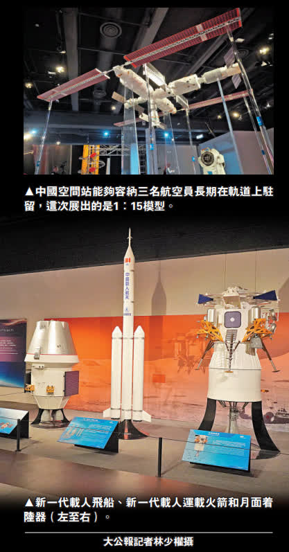 航天員如何飛上太空做科研?返回地面要乘坐什麼?一連兩個月的「中國載人航天工程展」將會展出近30組有關中國航天的展品,包括神舟飛船返回艙、艙內航天服、中國空間站模型,還有多支火箭的模型如長征二號F、長征七號、長征五號B運載火箭,以及新一代載人飛船及月面着陸器模型等。