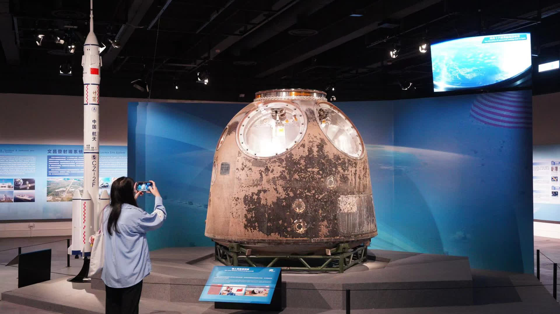首次在香港展出的三噸重神舟十三號飛船返回艙真實呈現,今次訪港的航天員王亞平,連同翟志剛、葉光富在2022年曾乘搭飛船返回地面,返回時採用降落傘系統進行減速,並在着陸前燃點反推發動機進行軟着陸,而旁邊的長征二號F運載火箭模型則是用於發射神舟載人飛船。