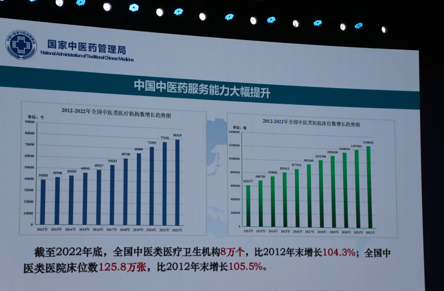 黃璐琦說,近年來,我國中醫藥事業快速發展。截至2022年底,全國中醫類醫療衞生機構8萬個,比2012年末增長104.3%;全國中醫類醫院床位數125.8萬張,比2012年末增長105.5%。中醫類總診療量為12.25億人次,佔總診療量14.6%。中醫藥服務體系不斷完善,中醫藥防病治病獨特優勢和作用充分彰顯。