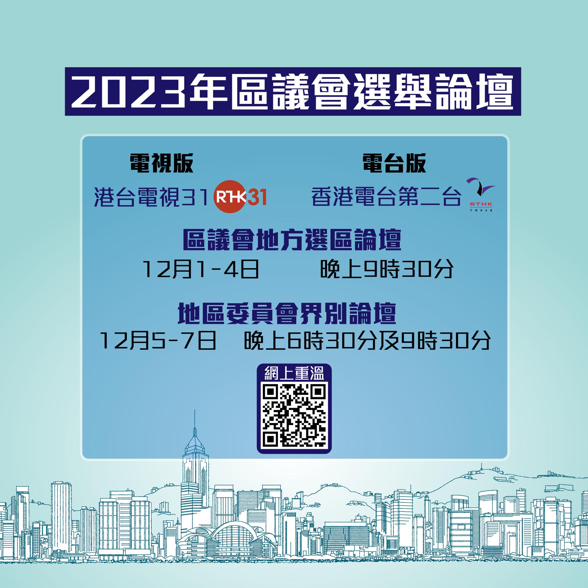 大公文匯全媒體報道,距離2023年區議會選舉投票日還有不到一周,由香港電台製作的《2023年區議會選舉論壇》將於今晚(12月1日)起至12月7日,連續7天晚上在港台電視31頻道播出,電台版同期在FM94.8香港電台第二台播出。