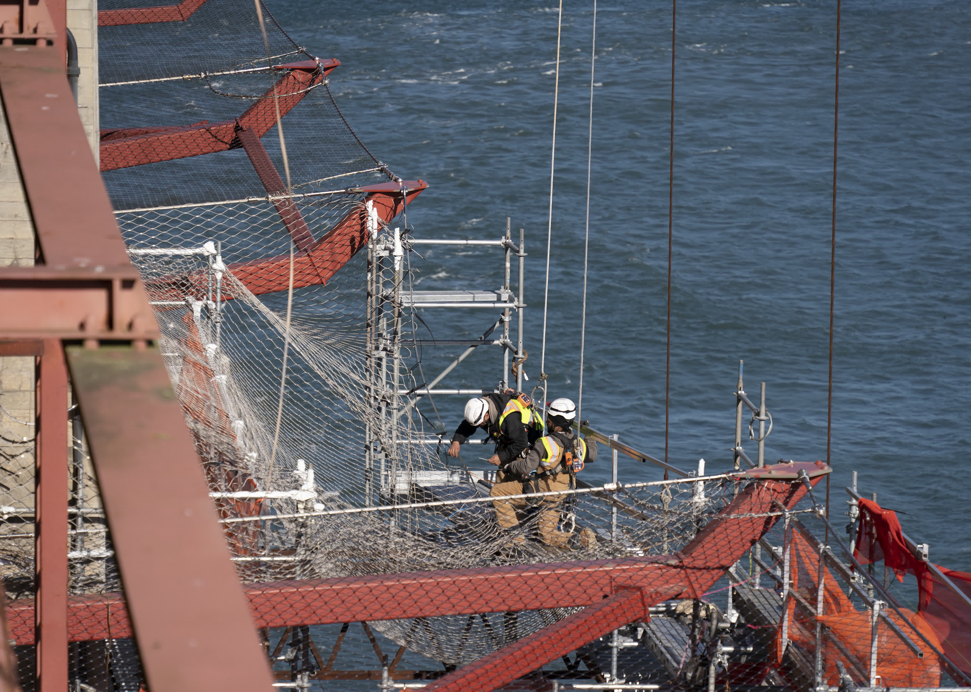 經反覆討論,金門大橋自殺防護網項目於2014年獲批。2018年,施工人員開始在這座長約2.7公里的大橋兩側加裝防護網。項目原計劃2021年完工,但由於工作人員和主承包商發生變動,工程進度被推遲兩年。