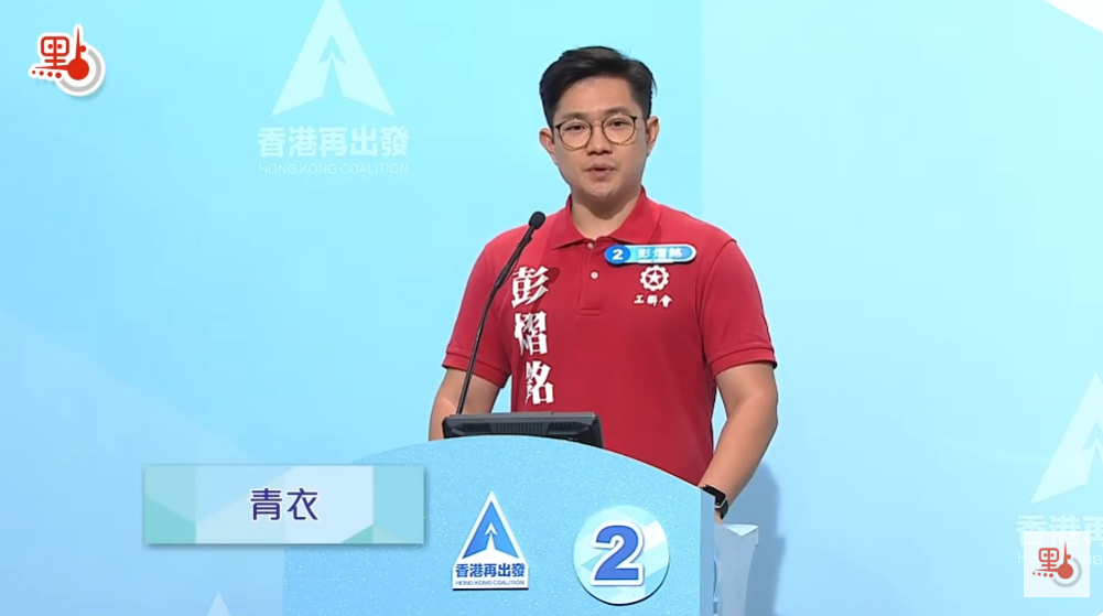 2號候選人彭熠銘指,極端天氣今年頻繁發生,他作為社區服務工作者,深深體會到天氣對居民的影響,尤其青衣區樹木較多,必須提前做好預防措施。他表示,如果當選,會及早通知部門做好鋸樹、清理渠務等工作;當日亦會提醒市民出門前做好防範措施。而在極端天氣過後,他會即時親身出來視察,找出淤塞的水渠和大樹倒塌的位置。他提到,自己致力改善區內無障礙設施,包括爭取興建無障礙斜坡、改善天橋樓梯工程,強調改善社區設施並非空談,需要銘記用心服務的初心。