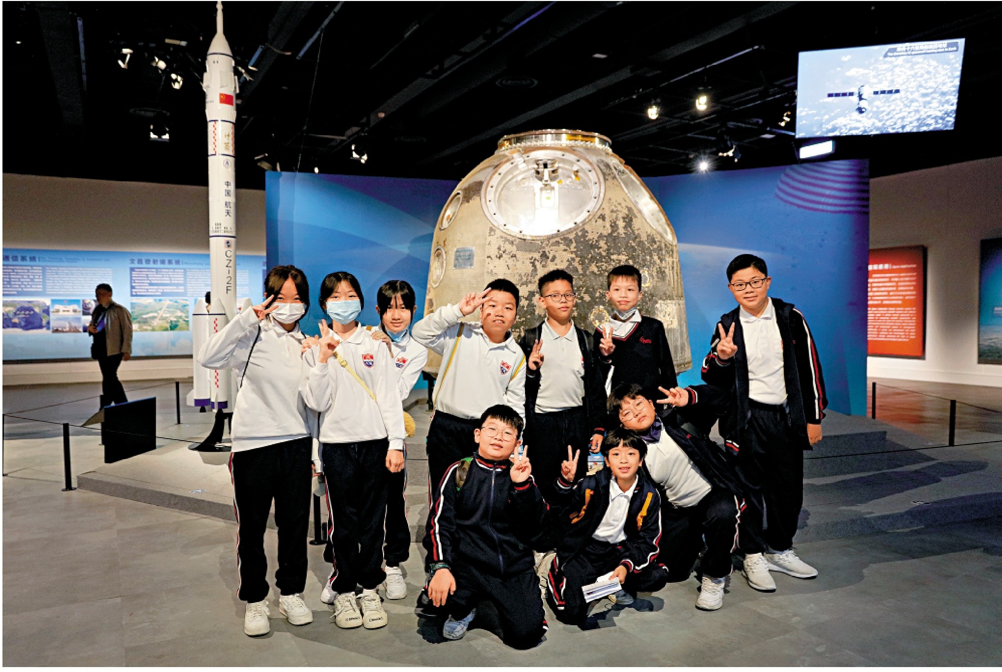 多間中學、小學與幼稚園都有趁展覽首日,組織學生到來參觀,除了返回艙,「模擬空間站對接」及「太空照相館」同樣吸引大批學生體驗。在「太空照相館」前站在指定位置,透過鏡頭,屏幕中就會顯示自己穿上航天服的樣子,並變換多個太空中的場景,不時有學生排隊等候,希望拍照留念,也算圓一次成為航天員的夢。