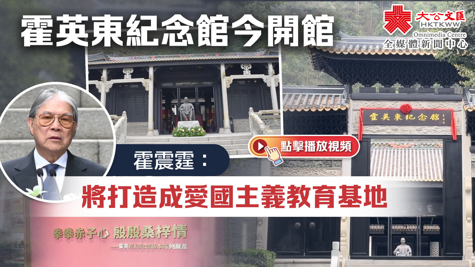 霍英東集團主席霍震霆在開館致辭時表示,霍英東先生的一生,是愛國的一生、奮鬥的一生、奉獻的一生。這種無私奉獻的精神和愛國心,是中華民族自強不息精神的體現。他表示,未來將把紀念館打造成為愛國主義教育基地,希望成為粵港澳地區乃至全球華人文化交流的新地標。在粵港澳大灣區飛速發展的時代背景下,希望更多港澳青年融入國家發展大局,在大灣區的廣闊天地寫下更精彩的人生。