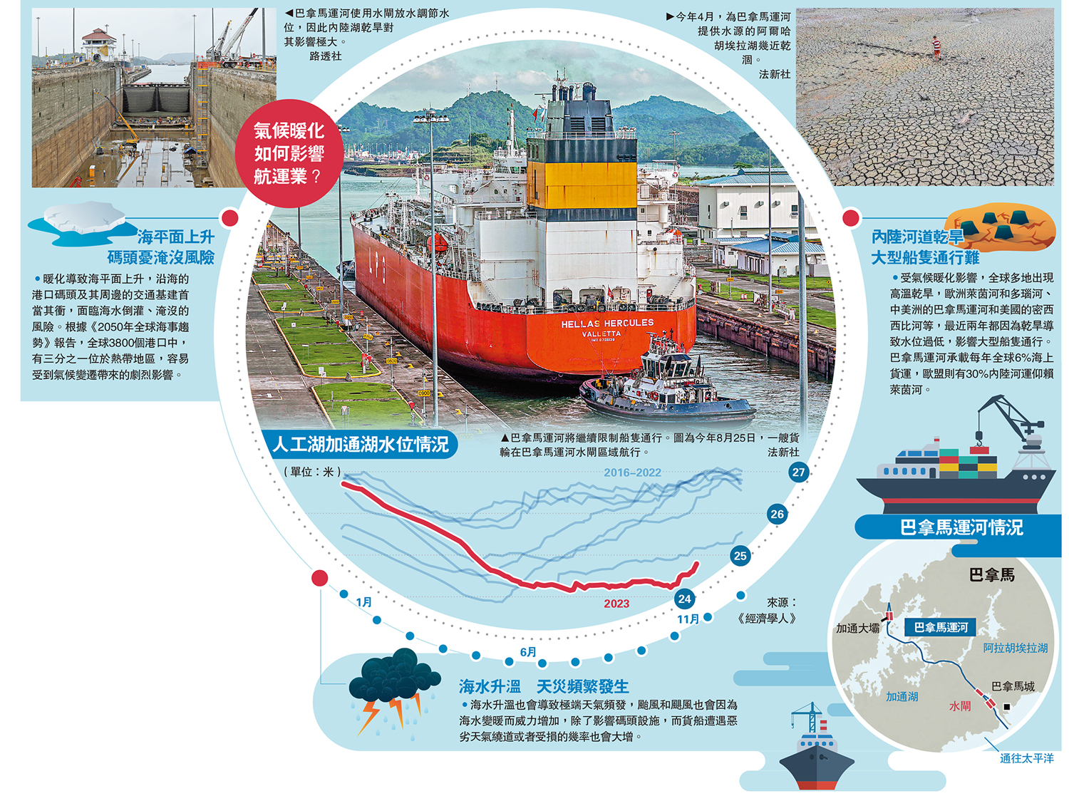 大公報綜合CNN、彭博社、《經濟學人》報道:在所有運輸業中,航運業是最容易受氣候變遷打擊的領域之一,無論是海洋、河道或運河都會受到暖化的影響。近期,中美洲國家巴拿馬遭遇70多年來最嚴重乾旱,巴拿馬運河的運輸嚴重受到影響,限制船隻通行的措施從周五起進一步收緊,而限行措施或持續至明年6月,外界擔憂這可能導致國際物流成本會因此上升,使得全球航運業出現新危機。