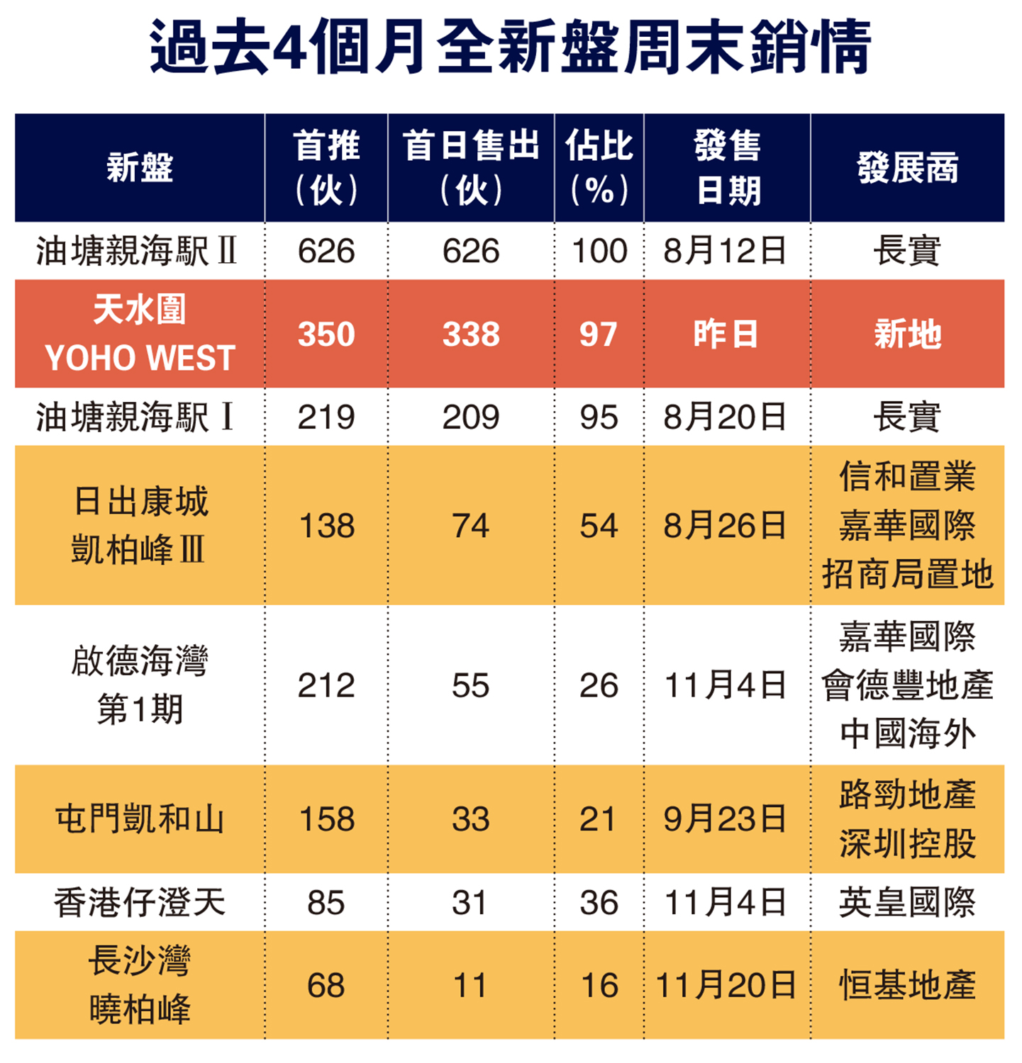 綜合市場消息指,在YOHO WEST的帶挈下,昨日主要新盤共錄351宗成交,是自長實油塘親海駅Ⅱ今年8月單日沽清626伙後,3個月最旺的周六新盤銷情。至於12月首兩日,一手市場共賣逾360伙,是上月約540宗的近七成,同時高於9月及10月的約280宗及344宗。