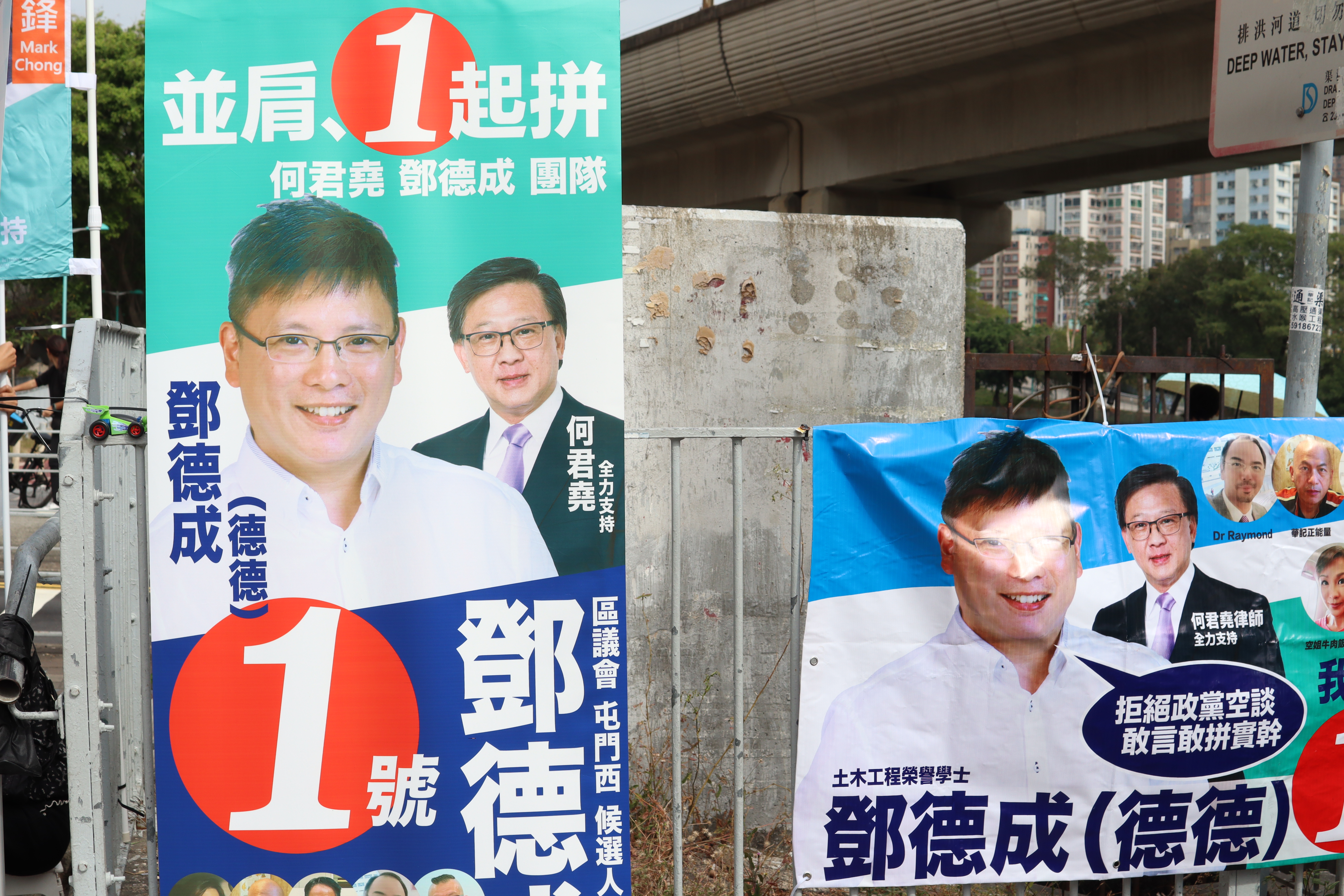 雖然因時間原因,未能遇到候選人鄧德成本人受訪,但其街站和宣傳品亦隨處可見。